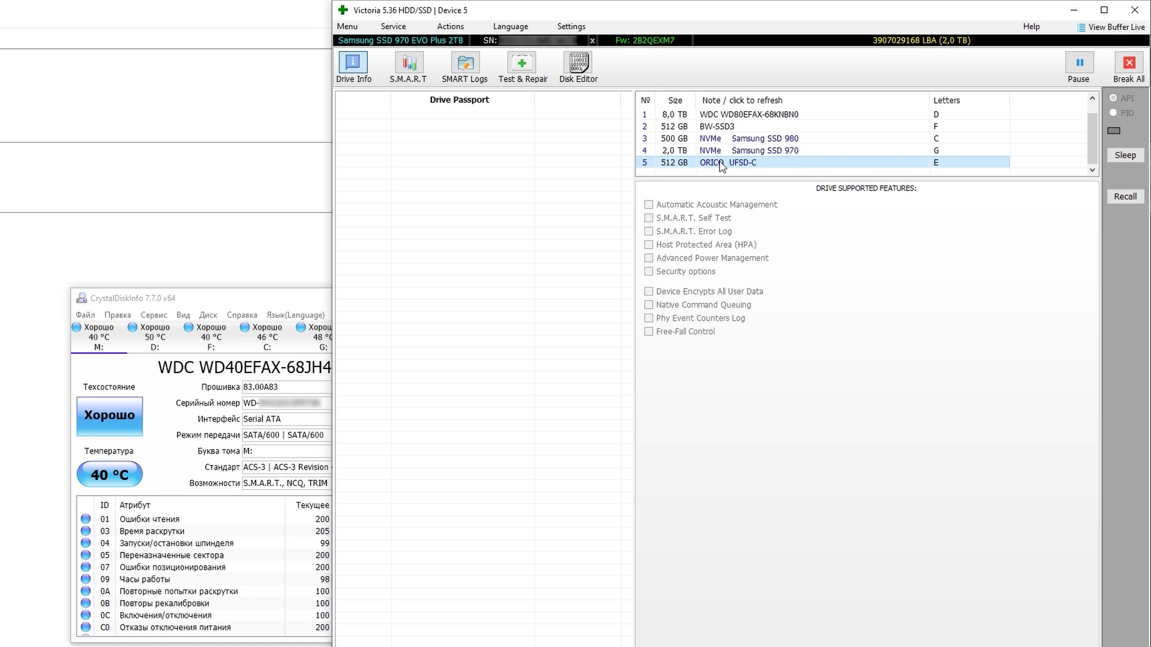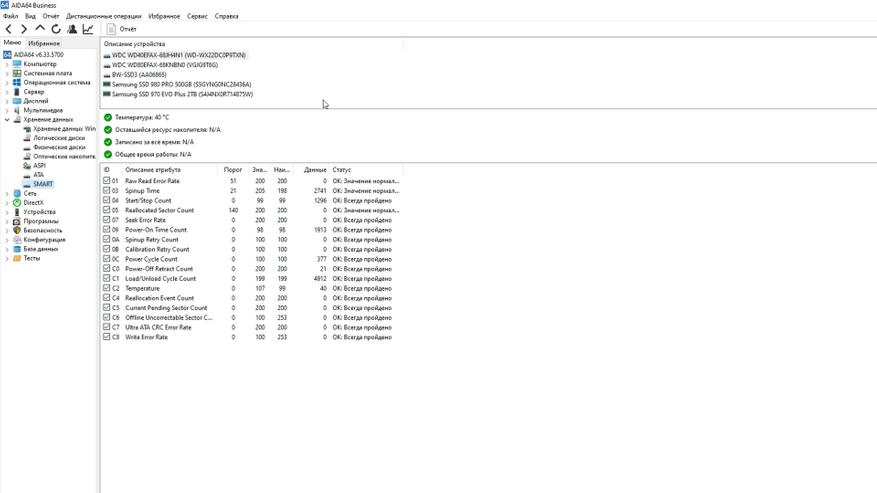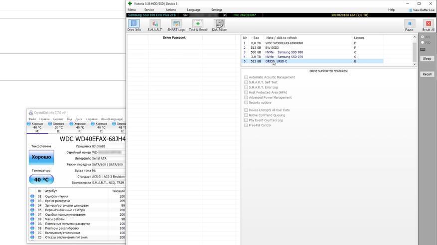 Поскольку специализированные программы и утилиты не позволяют получить подробную информацию об этом накопителе, диск не определяется в системах как стандартный носитель. В результате ни данные SMART, ни другая служебная информация недоступны. Даже программа Victoria распознаёт устройство, но не может извлечь из него никаких сведений — лишь указывает, что это не ATA‑ и не HDD‑устройство. Возможно нужны более низкоуровневые утилиты, опыт и время для проведения такого рода диагностики
