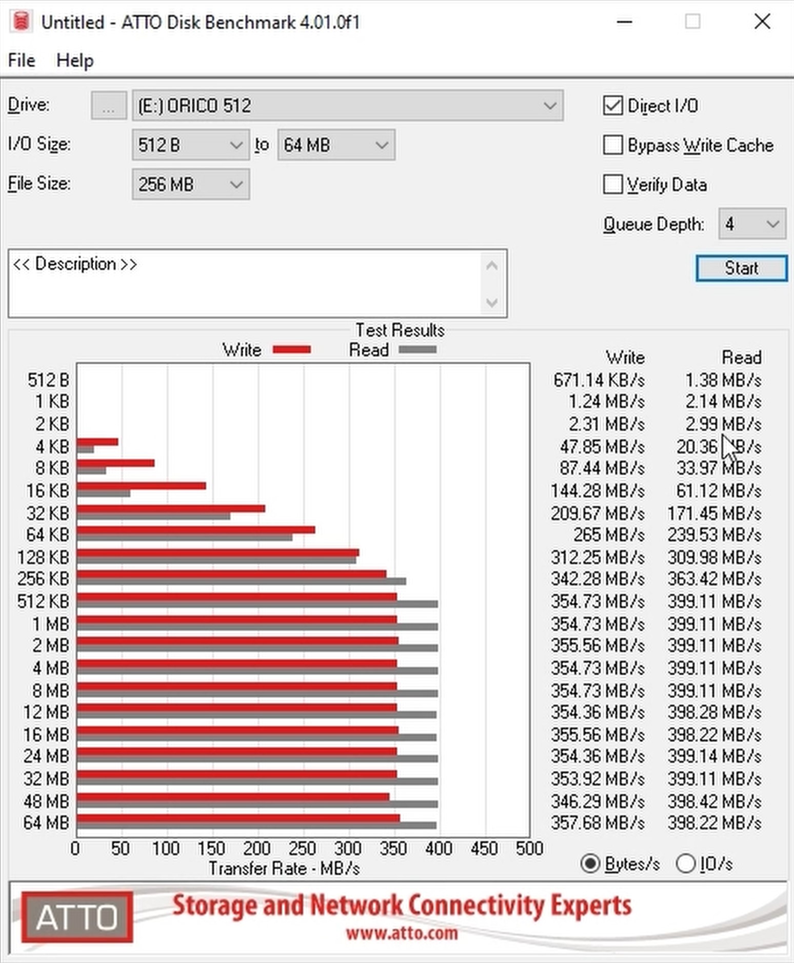 Так например программ ATTO DISK Benchmark, измеряет скорость записи и чтения при работе с файлами разного объёма. Результаты теста показали, что расчётные скорости достигаются при работе с файлами от 512 КБ и выше. В этих условиях зафиксирована: