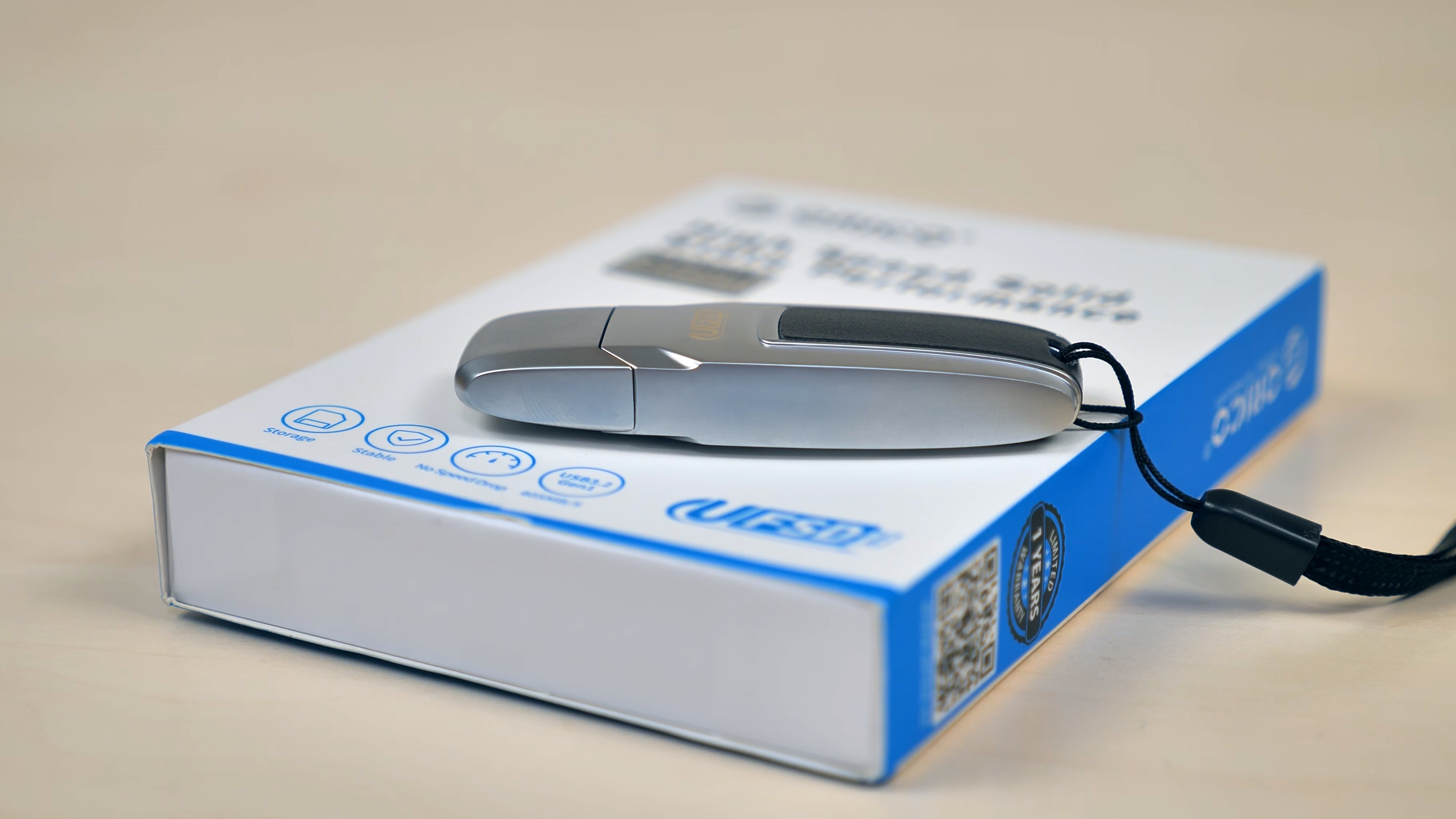 В комплекте есть темляк для переноски накопителя на запястье или фиксации на каком‑либо предмете — чтобы не потерять устройство. Также прилагается инструкция пользователя на китайском и английском языках.