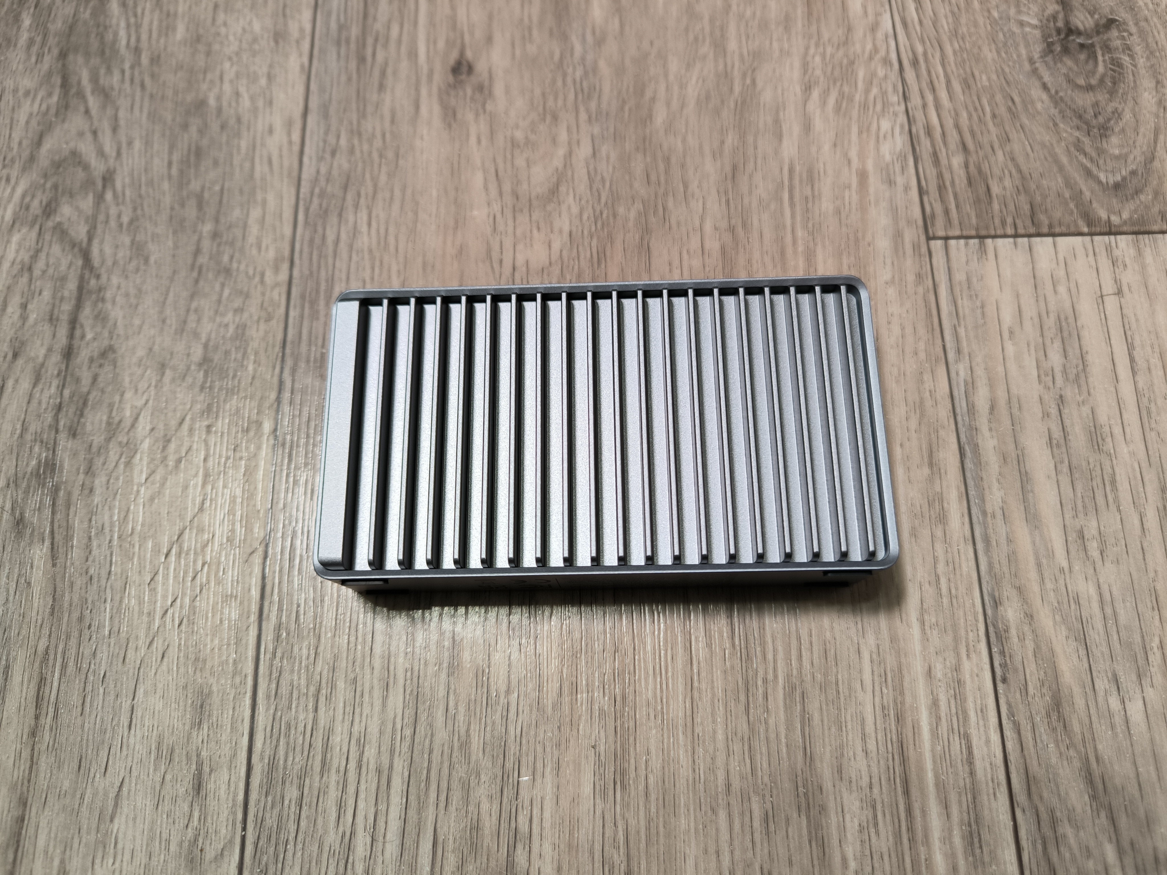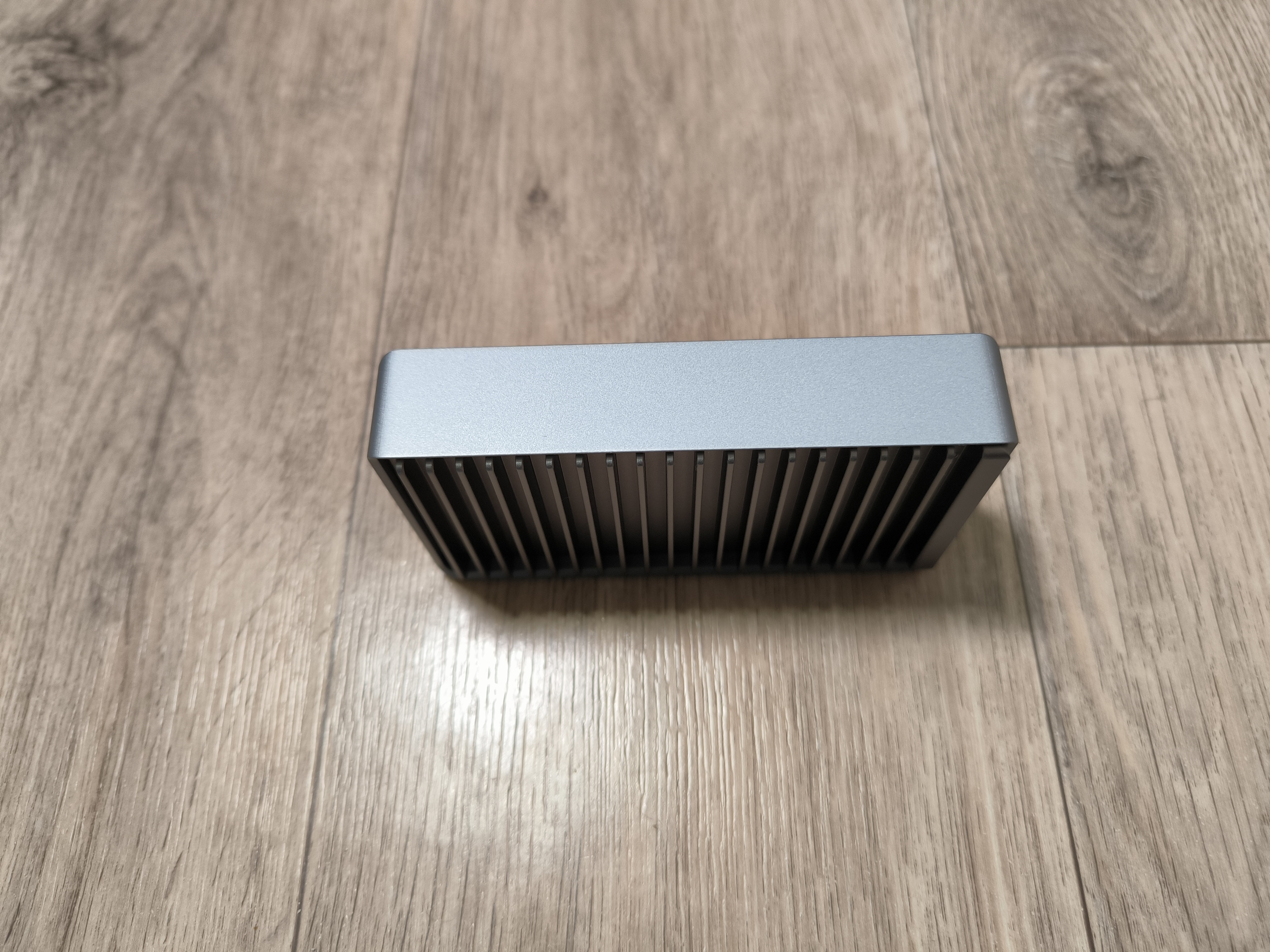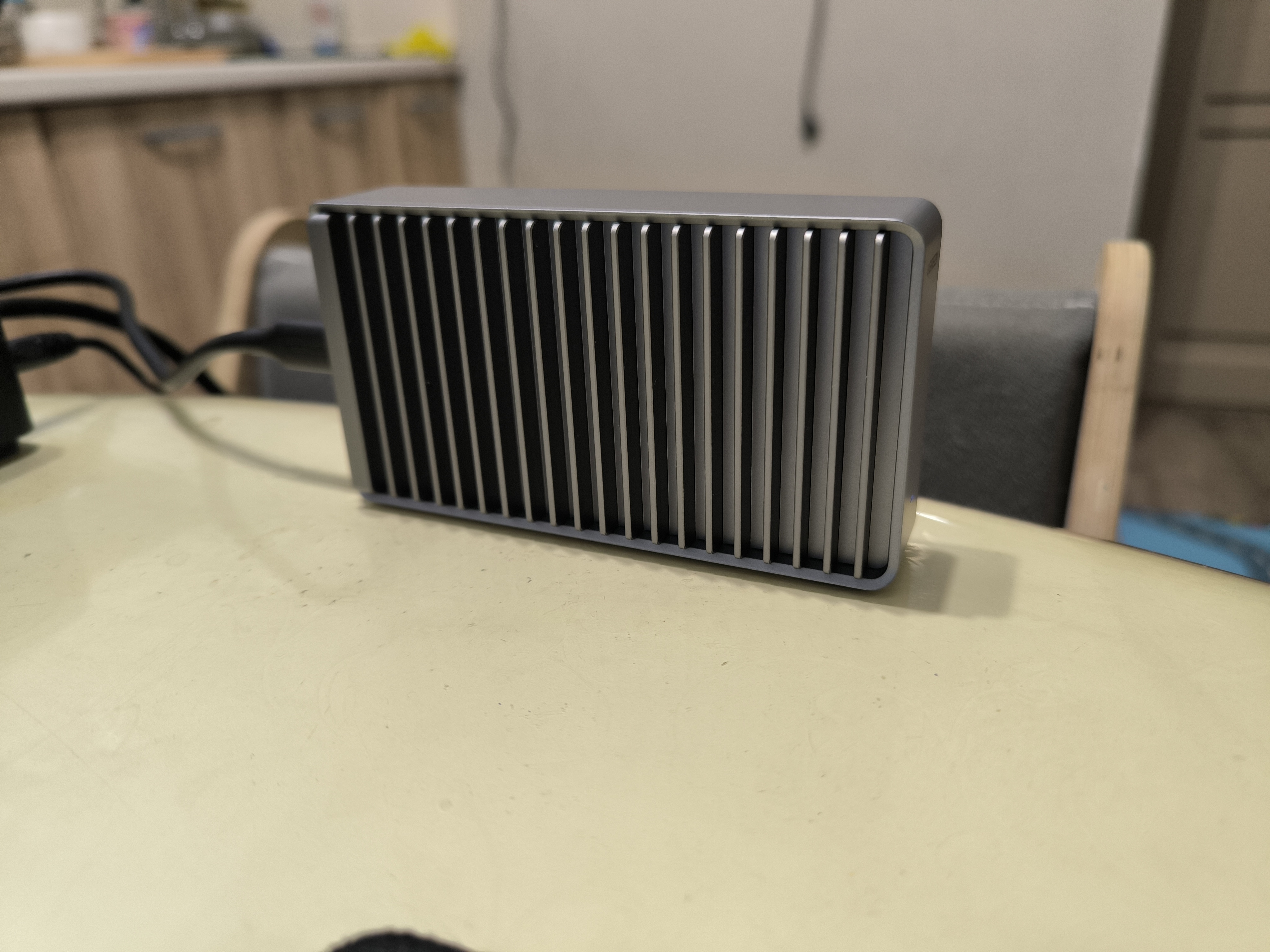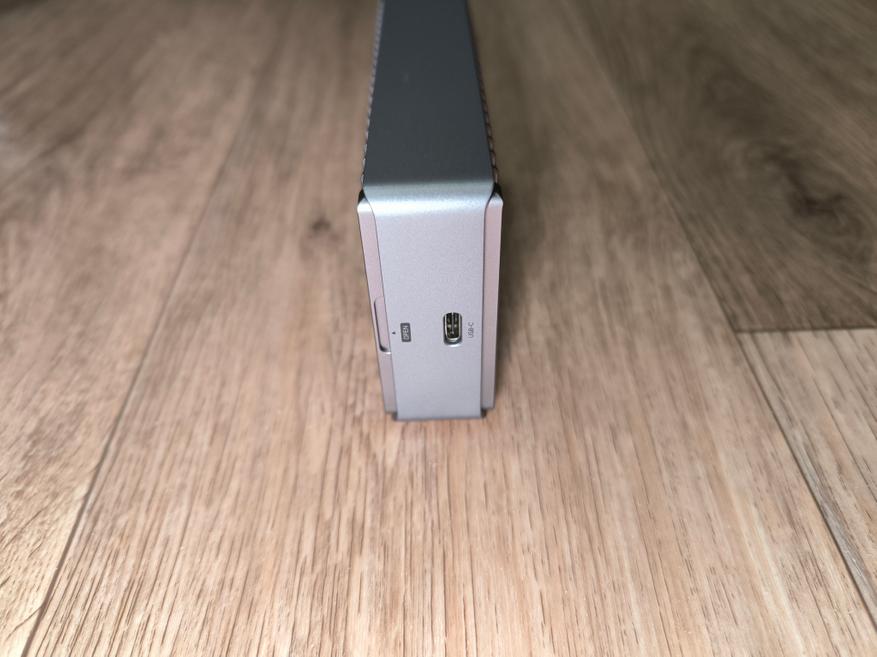 При этом, для эффективного отвода тепла производитель предусмотрел 4 ножки на нижней части бокса, при установке на которые, у меня возникли ассоциации с домашним обогревателем. Но ничего плохого в этом нет, ведь основная задача здесь это рассеивание тепла. На столе бокс зафиксировался уверенно, но пришлось сперва немного «поукращать» USB кабель, так как он здесь довольно-таки жёсткий и не сильно гибкий, ввиду своей специфики.