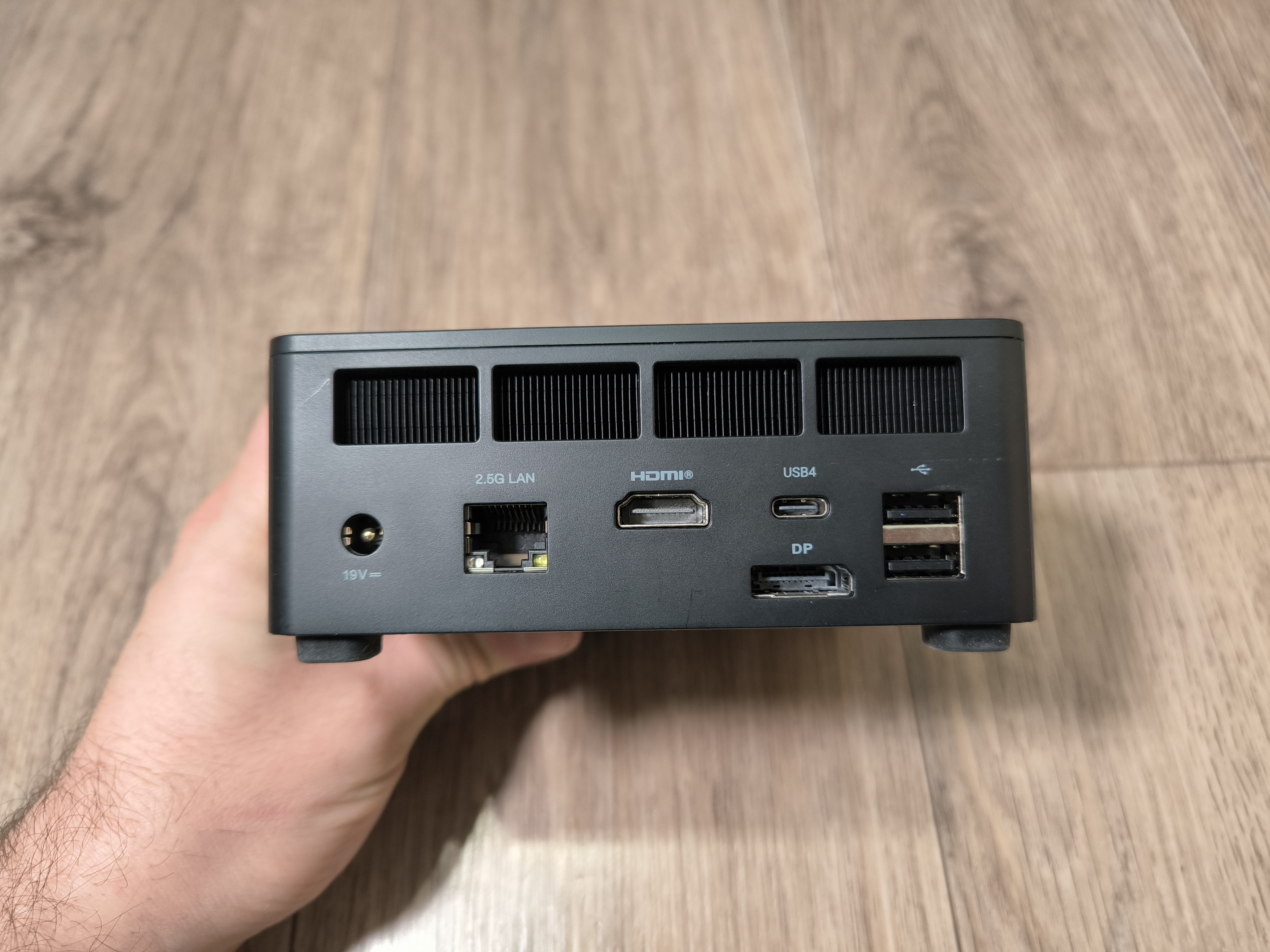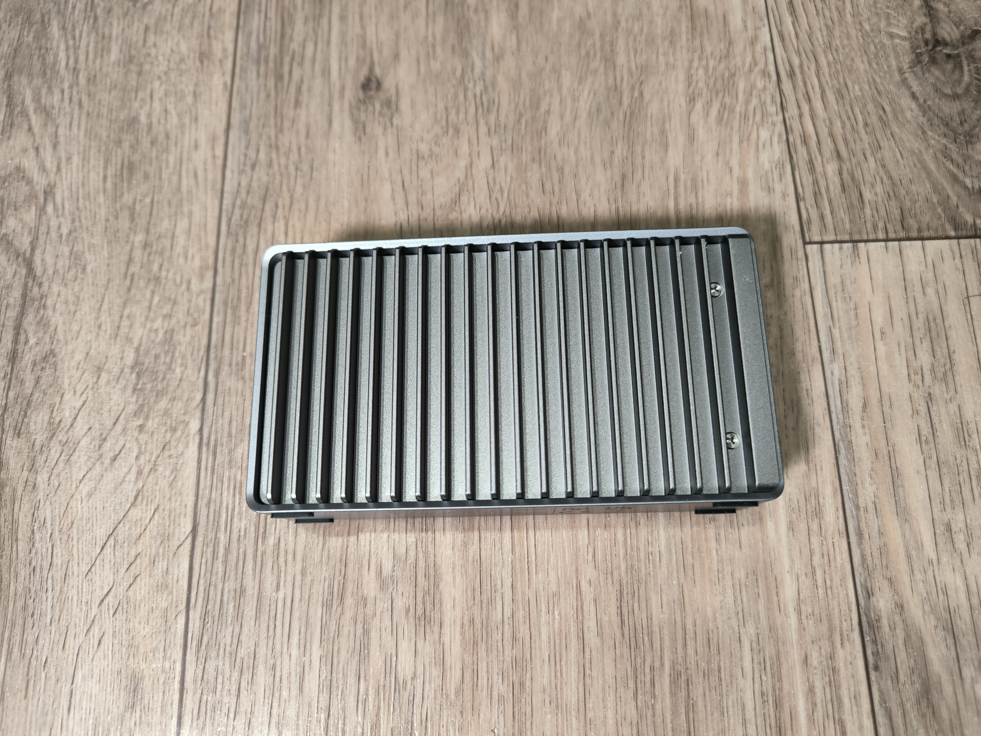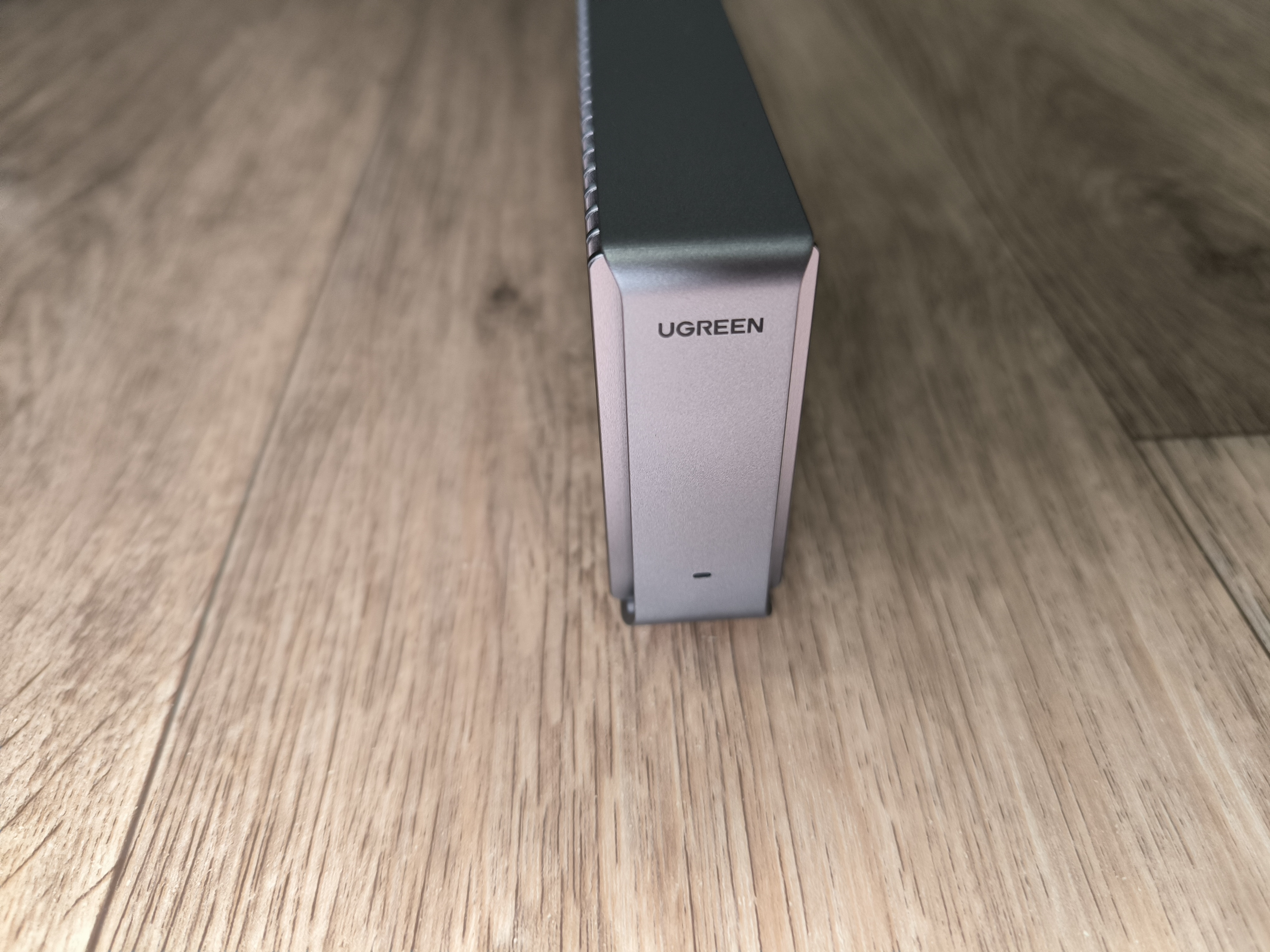 При этом, для эффективного отвода тепла производитель предусмотрел 4 ножки на нижней части бокса, при установке на которые, у меня возникли ассоциации с домашним обогревателем. Но ничего плохого в этом нет, ведь основная задача здесь это рассеивание тепла. На столе бокс зафиксировался уверенно, но пришлось сперва немного «поукращать» USB кабель, так как он здесь довольно-таки жёсткий и не сильно гибкий, ввиду своей специфики.