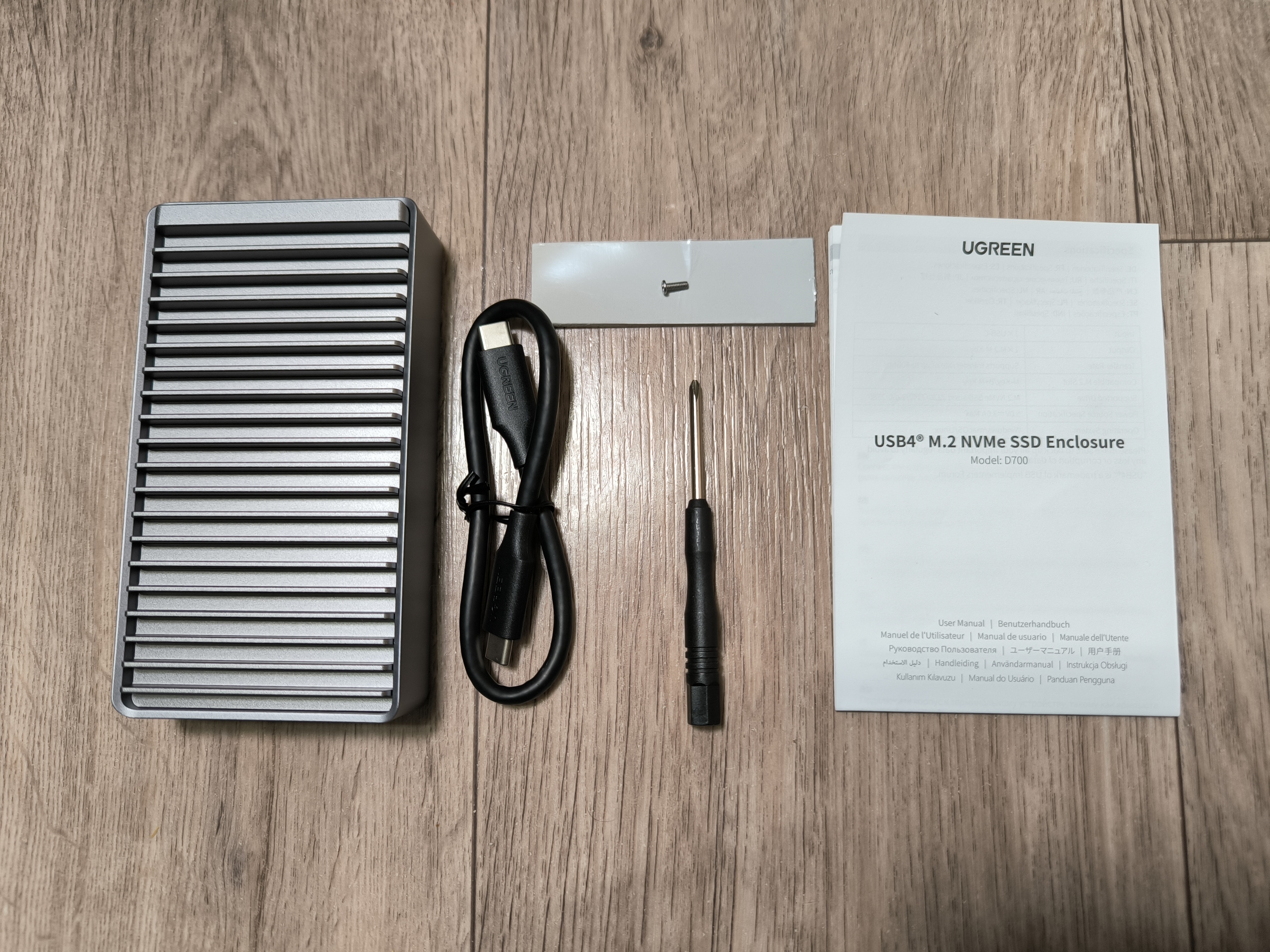 Вместе с USB 4 боксом находится кабель Type-C to Type-C (30см), термопрокладка (теплопроводность 2Вт/м*к), винт, отвёртка, и инструкция.