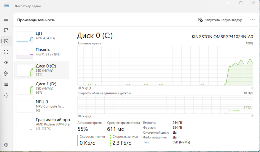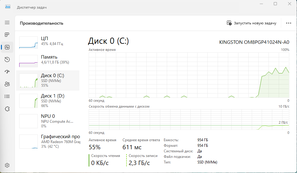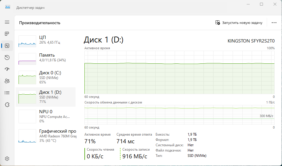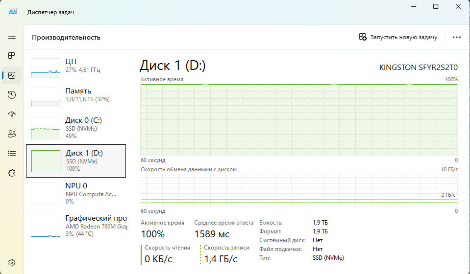 Скорость записи в один поток составила около 1ГБ/c, а скорость записи в два потока, составила уже 1.4ГБ/c, и по 100% загрузке накопителя видно, что это его потолок. Скорость чтения в один поток составила 2.3ГБ/c.