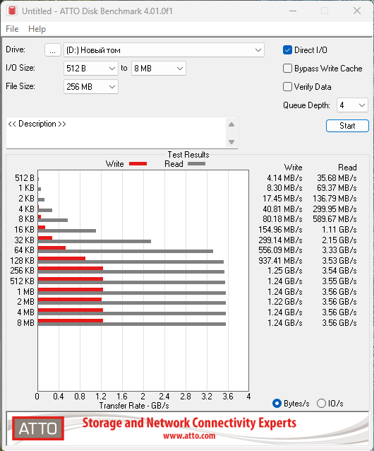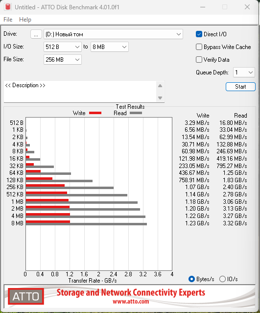 Так же, чисто для информации, приведу результаты тестирования скорости в программе ATTO Disk Benchmark, при разной глубине очереди.