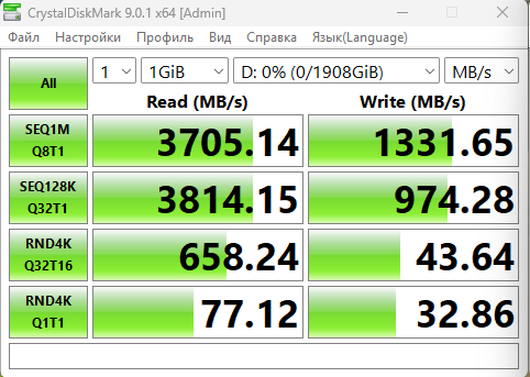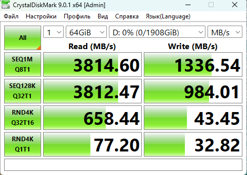 Как видно со скриншотов, максимальная скорость чтения составила 3814МБ/c, что значительно выше, чем у боксов с поддержкой интерфейса USB 3.2 Gen2 x1 (10Гбит/c) и USB 3.2 Gen2 x2 (20Гбит/c). Судя по получившейся скорости линейного чтения, можно сделать вывод, что накопитель действительно работал в режиме PCI-E Gen4, но получившаяся скорость оказалась лишь немного выше возможностей более медленной шины PCI-E Gen3, при условии использования 4-х линий. При этом, максимальная скорость записи получилась ощутимо скромнее чем максимальная скорость чтения. С одной стороны, здесь в больше явном виде могли проявиться задержки передачи (относительно их влияния при операциях чтения), но возможно проявились и какие-то ограничения со стороны самого мини-компьютера, в любом случае, получившиеся скорости всё равно достаточно высокие.