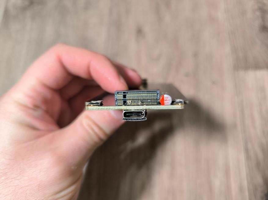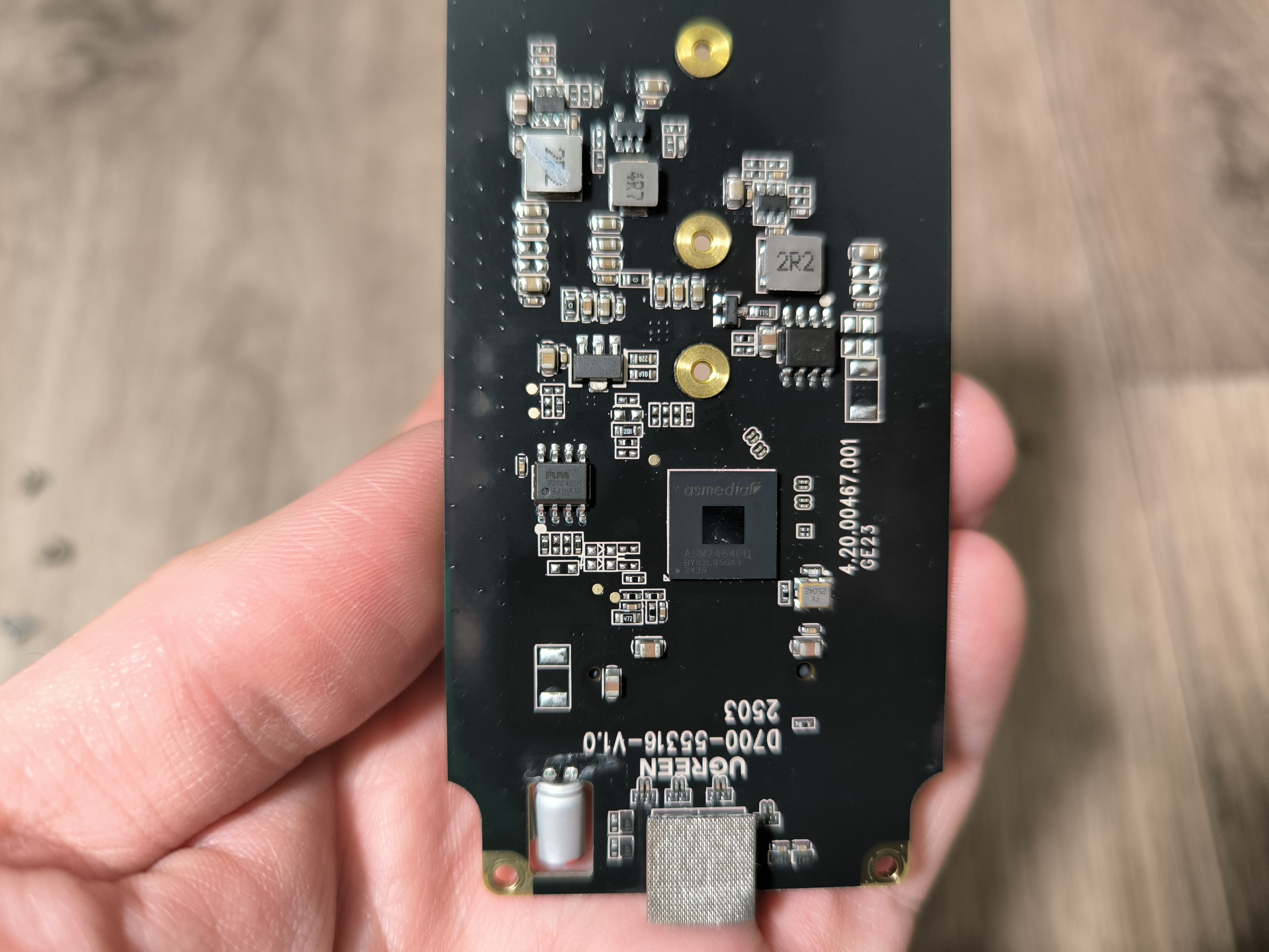 На плате распаян контроллер ASM2464, и дополнительная обвязка. Судя по всему, для снижения пульсаций по питанию SSD, здесь же распаян электролитический конденсатор на 330мкФ 6.3В.