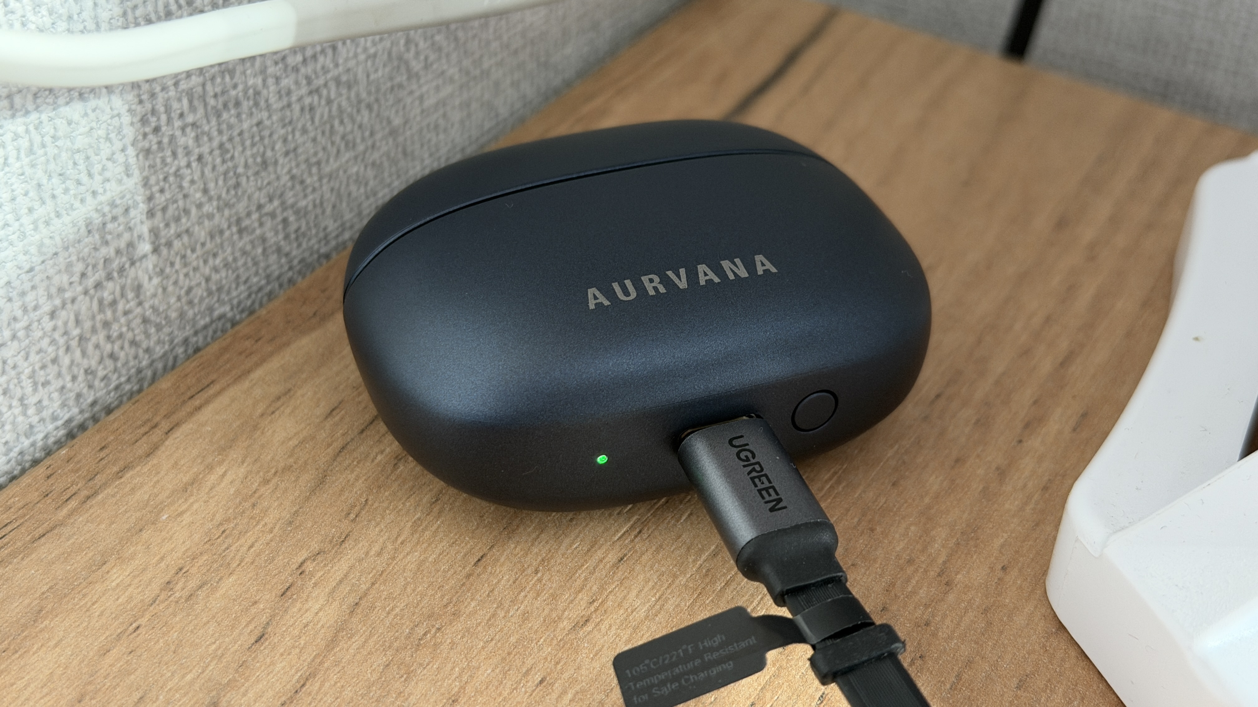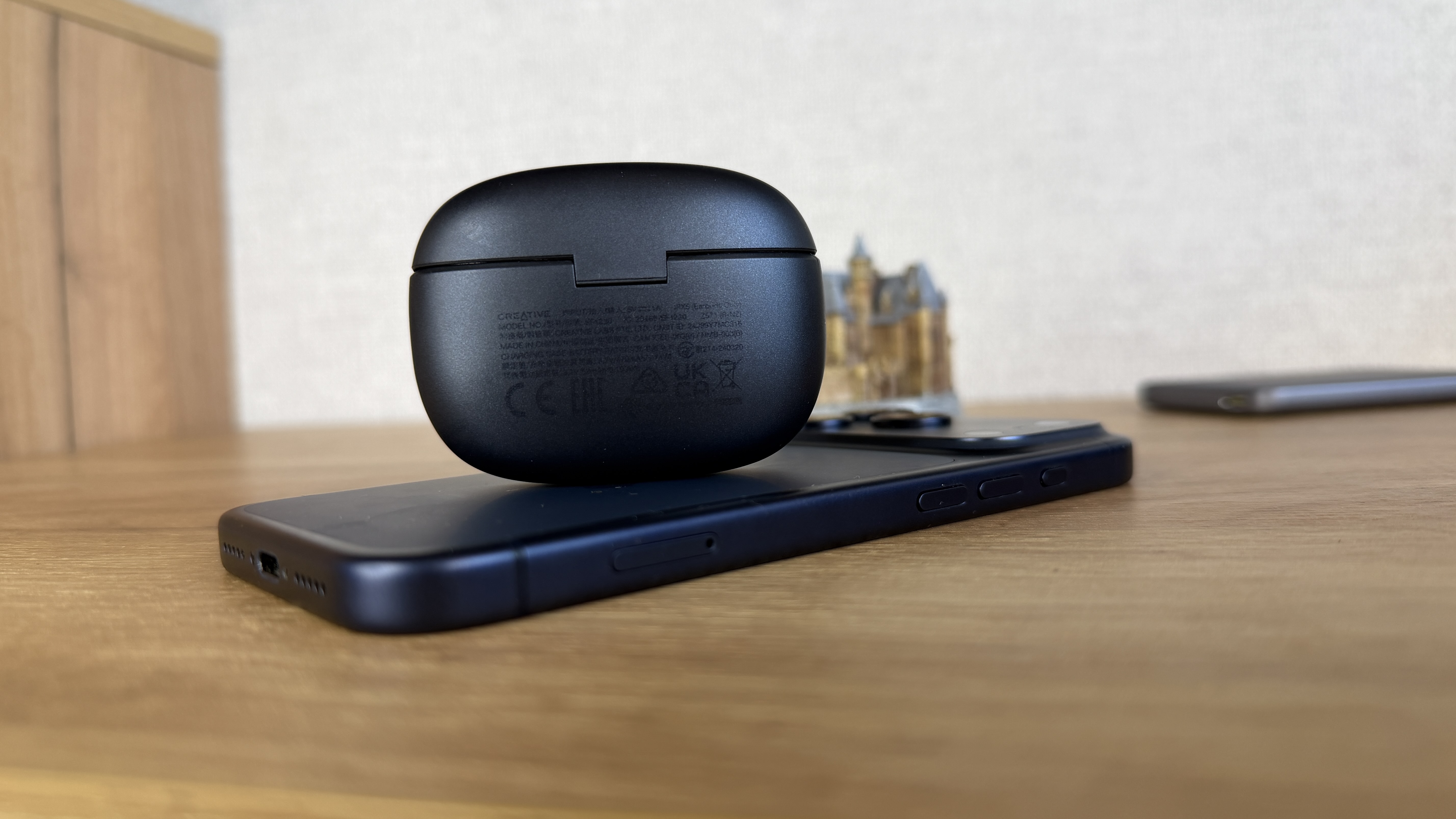 На правом боку кейса — отверстие для шнурка-темляка, что очень удобно, на мой взгляд. На левом просто скруглённые грани, сзади просто пластиковый шарнир открытия крышки и информация о производителе. Снизу Type-C разъем для зарядки, индикатор зарядки и кнопка синхронизации.