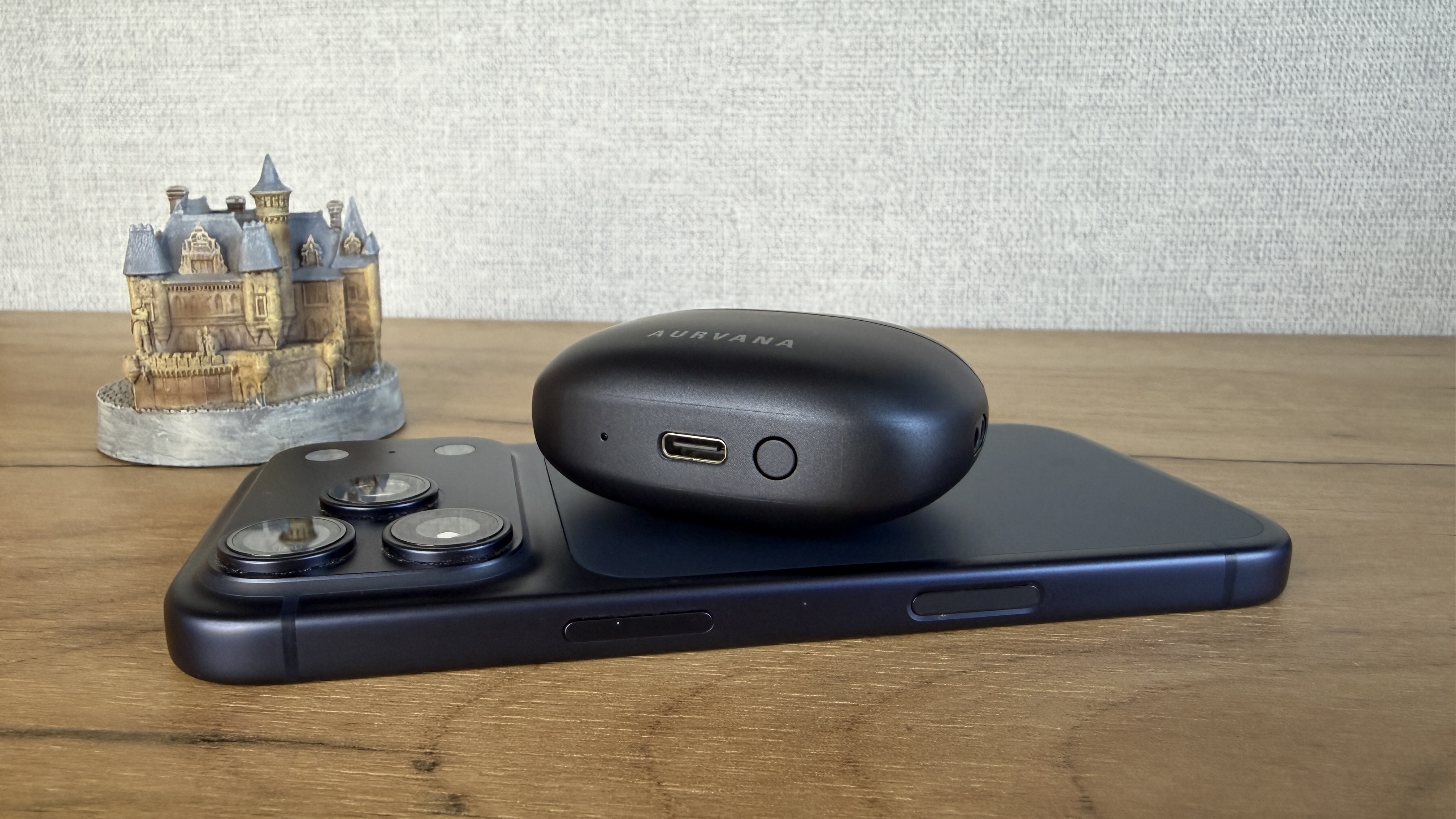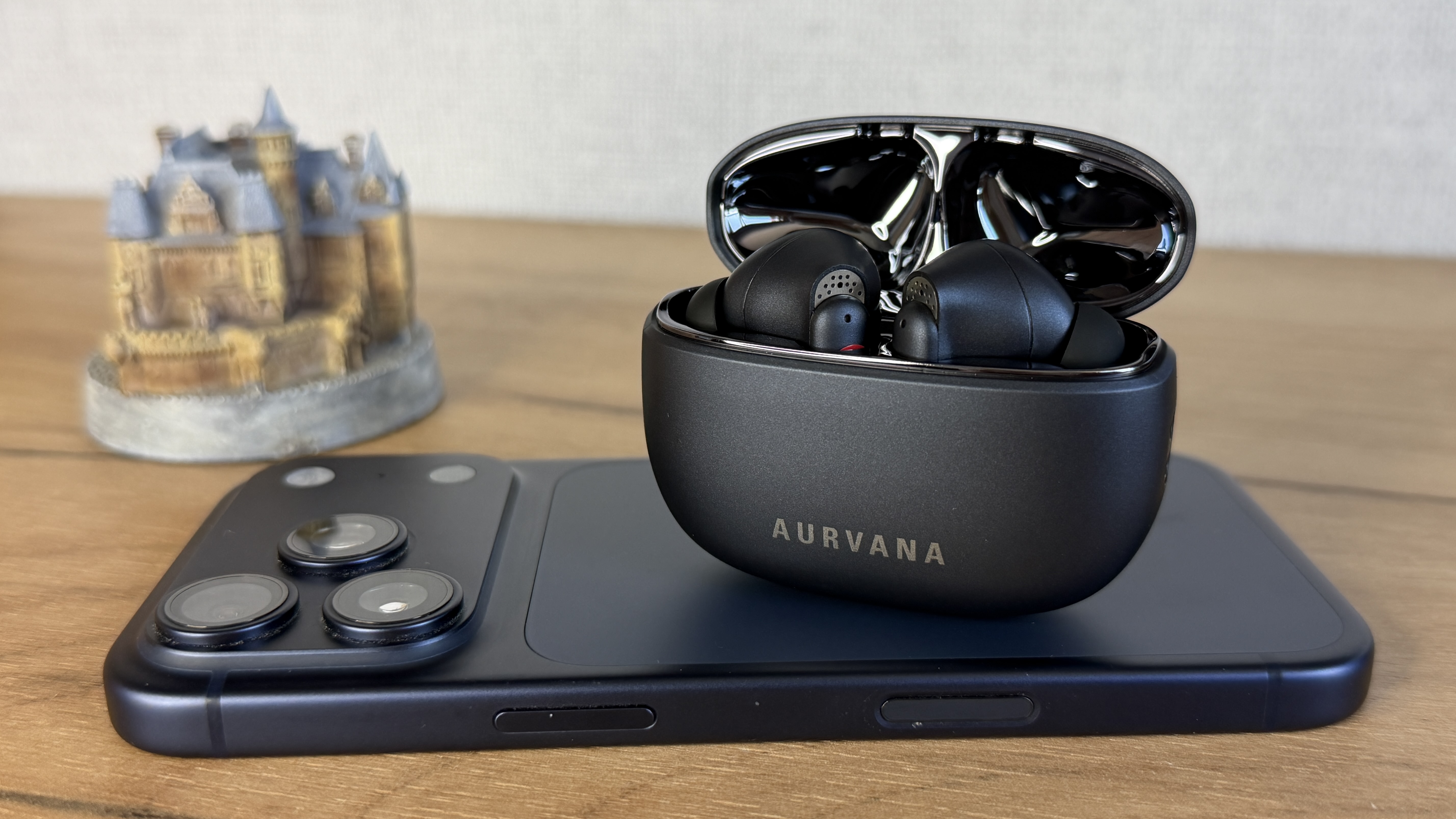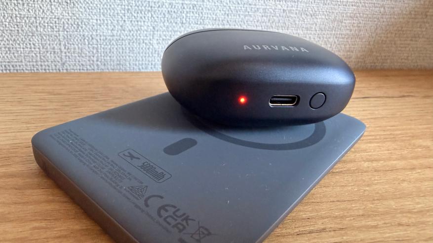 Эти наушники бывают в трех разных модификациях, которые носят название Ace и Ace2 и ACE mimi. Во второй версии дизайн с прозрачным кейсом с стимпанк дизайне. В моей версии (Mimi) пластиковый корпус и кейса, и наушников в глубоком синем цвете. Собственно, по цвету очень рядом с синим последнего Айфона. На лицевой cтороне нанесено название линейки наушников Aurvana. Выемка между крышкой и остальным корпусом довольно заметная, легко подцепить пальцем и открыть одной рукой.