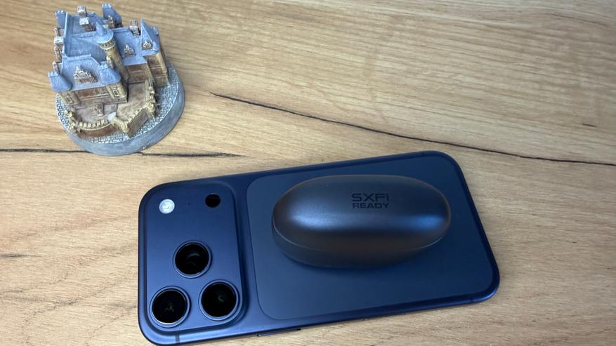 Сверху на крышке выгравирована надпись SXFI Ready, что означает, что эти наушники сертифицированы по стандарту Super X-Fi Spatial Holography от этого производителя. Заявлено, что звучание адаптируется под анатомию уха, которая индивидуальна для каждого человека.