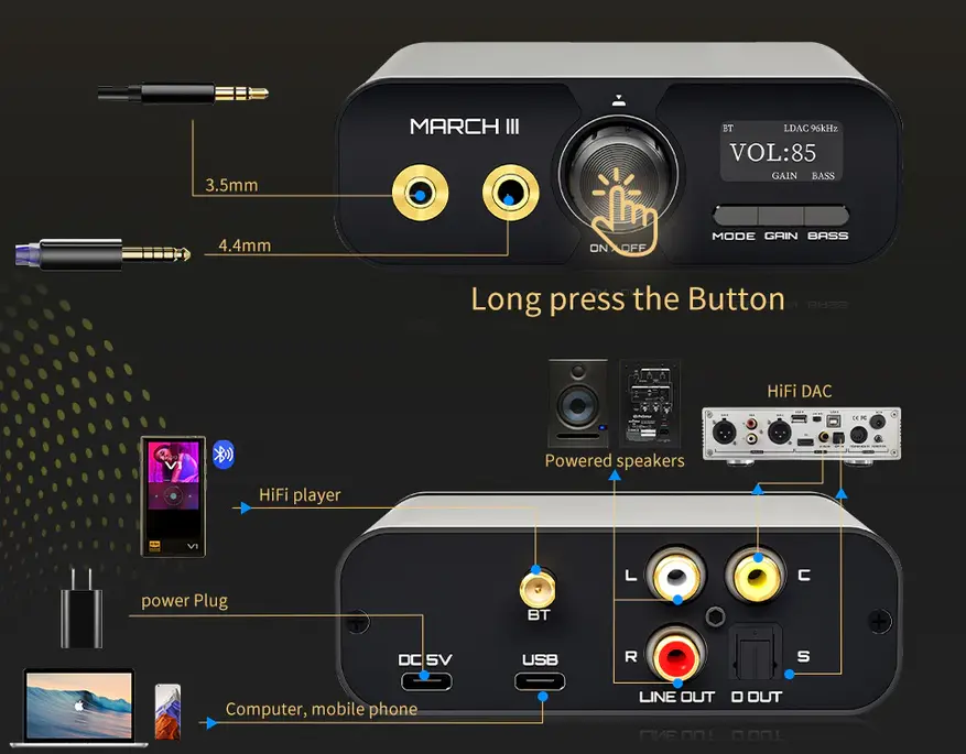 Настольный Hi-Fi USB-DAC и Bluetooth-приемник с усилителем, построенный вокруг высококлассного ЦАП AK4493SEQ и 4 OPA1688 усилителей, обеспечивающих детальный, низкошумный аналоговый выход. Он декодирует PCM до 32-бит/768 кГц, DSD512 и выполняет 8x MQA-развертку, а приём по Bluetooth 5.2 поддерживает LDAC, AAC и SBC. Устройство имеет USB-C вход, 3.5 мм и 4.4 мм выходы для наушников, RCA-линейный выход и оптику/коаксиал, а также OLED-дисплей, регуляторы усиления и баса для гибкой настройки звучания.