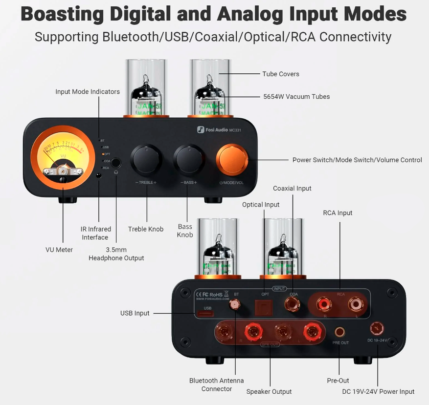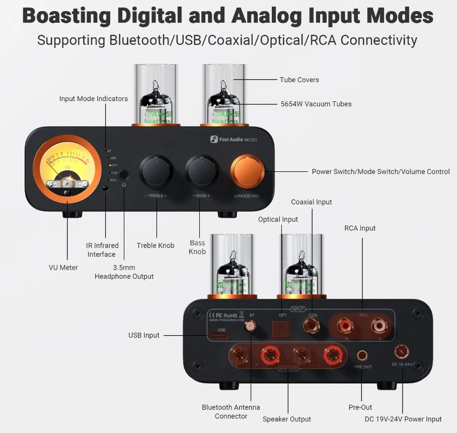Гибридный ламповый ЦАП-усилитель all-in-one с встроенным ЦАП, предусилителем, усилителем для колонок и наушников. Он сочетает лампы JAN5654W и транзисторный выход на TI TPA3221, отдаёт до 105 Вт x 2 при 4 Ω с SNR ≥ 100 дБ и низкими искажениями ≤ 0.03 %. MC331 поддерживает Bluetooth 5.0, USB, оптику, коаксиал и RCA входы, имеет 3.5 мм выход, pre-out и VU-метр, а также ручки регулировки басов/высот для тонкой настройки звучания.