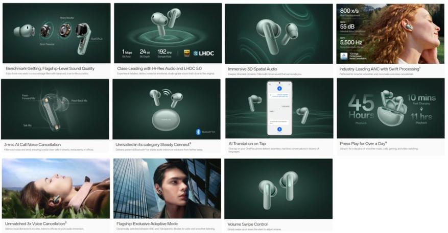 Аудиосистема устройства построена на базе двух независимых драйверов и пары цифро-аналоговых преобразователей. Инженеры OnePlus реализовали подавление окружающих шумов с эффективностью до 55 децибел. Наушники поддерживают высококачественный аудиокодек LHDC версии 5.0 и функциональность объемного звучания 3D Audio.
