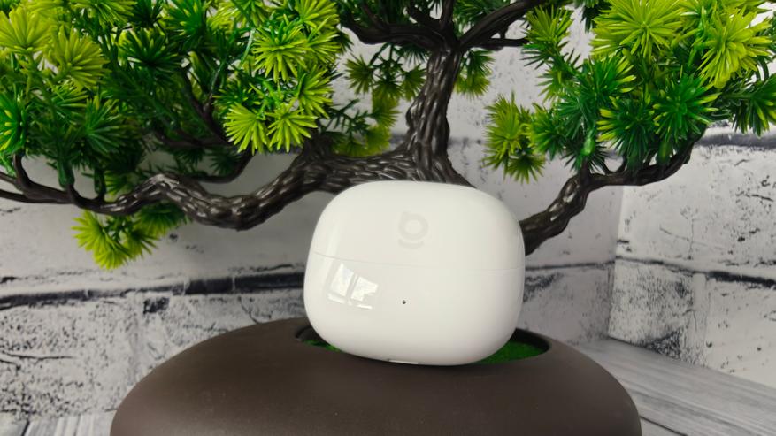 Кейс наушников выполнен по всем традициям подобных моделей — это полностью скруглённый пластиковый корпус. Пластик кейса — глянцевый белый. На лицевой стороне нанесен едва заметный логотип бренда. На нижней половинке заметен индикатор статуса работы.