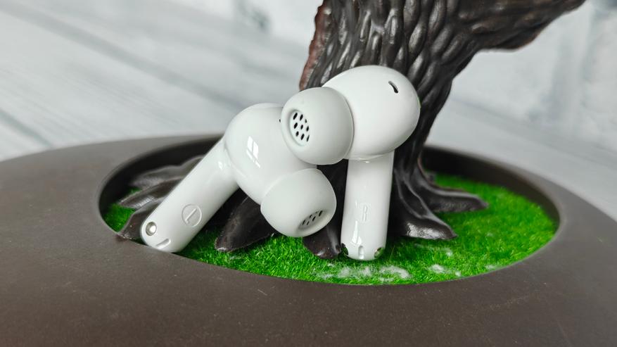 Наушники выполнены в традиционном исполнении — это капельки с ножкой и головкой, на звуководы которых надеваются силиконовые амбушюры. Каналы звука (левый и правый) заметно выгравированы на внутренней стороне ножки. Амбушюры дополнительно защищают звуководы силиконовой сеткой.