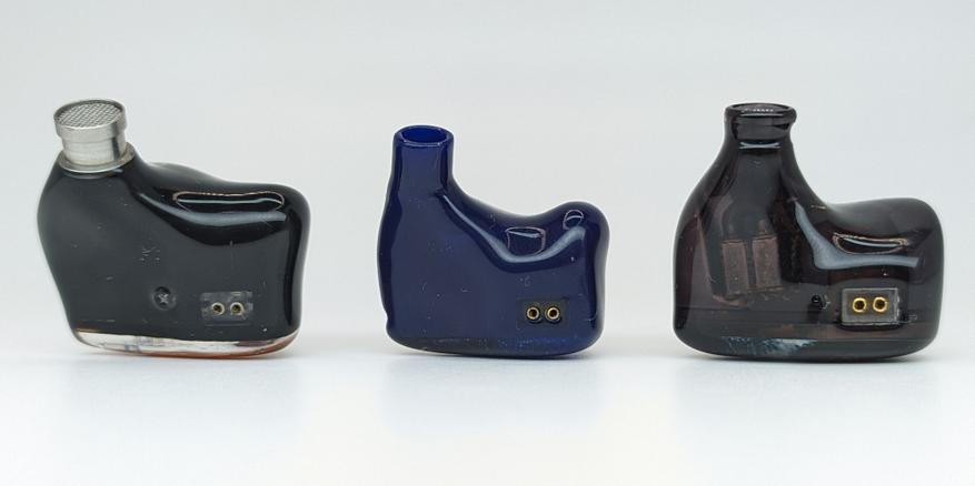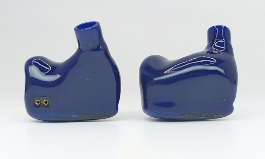 Анатомические пластиковые корпуса с акриловыми фейсплейтами. Одно компенсационное отверстие на узкой боковой грани. 2-pin разъем подключения кабеля вровень с корпусом. Бортиков для удержания насадок нет.