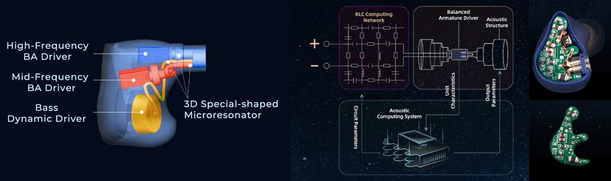 Своему уникальному звучанию Explorer обязаны 8-мм динамическому драйверу с биоцеллюлозной диафрагмой и двум широкополосным арматурным драйверам собственной разработки. Одна из арматур настроена с помощью кроссовера с технологией сетевого частотного разделения RLC на средние частоты, а вторая — на высокие частоты. Дополняют настройку специальные полости-микрорезонаторы в акустических каналах, идущих от драйверов.