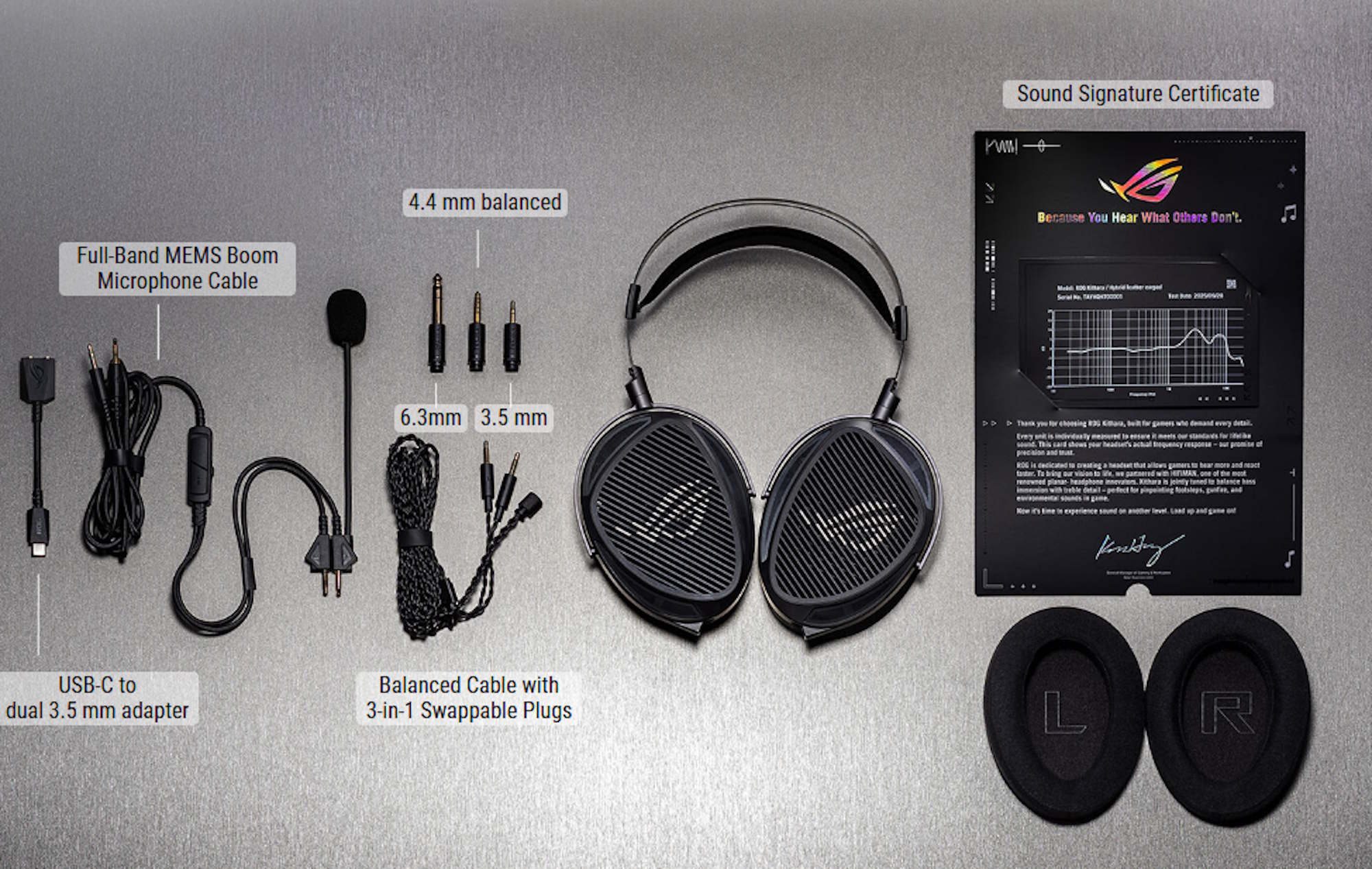 В гарнитуру встроен направленный микрофон на основе МЭМС-технологии с рабочим диапазоном от 20 Гц до 20 кГц. ROG Kithara подключается по проводу и комплектуется несколькими кабелями и переходниками: балансным разъёмом 4,4 мм, стандартными штекерами 3,5 мм и 6,3 мм, а также адаптером USB Type-C, что позволяет использовать гарнитуру с ПК, консолями, смартфонами и портативными аудиоплеерами.