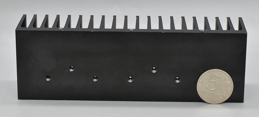 Что касается комплектного радиатора охлаждения, его размеры 155х50х40 мм, толщина подошвы 6,5 мм. Хоть его ребра правильно расположены для пассивного охлаждения (вертикально), этого радиатора явно мало для отвода заявленных 150 Вт.