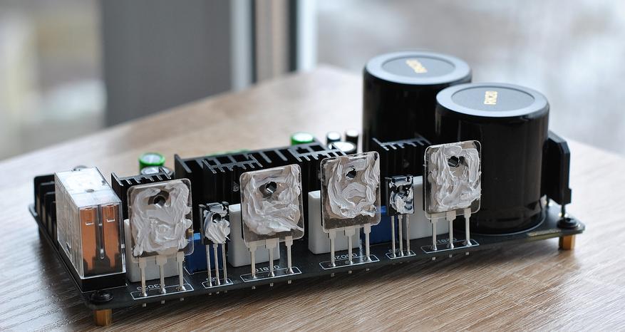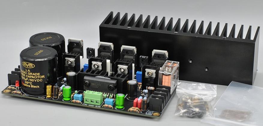 Я покупал по максимум: собранный и с радиатором. В комплекте с платой поставляются прокладки для транзисторов из слюды, латунные стойки для платы и крепеж.