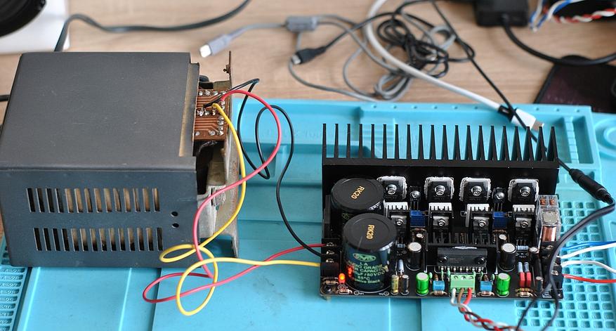 Первое прослушивание я делал без корпуса, буквально подкинул плату к трансформатору 20-0-20 В, источник звука ПК, акустика — двухполосные настольные мониторы.