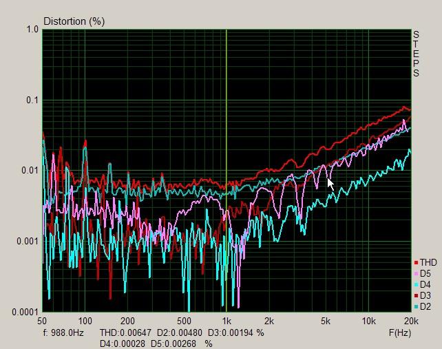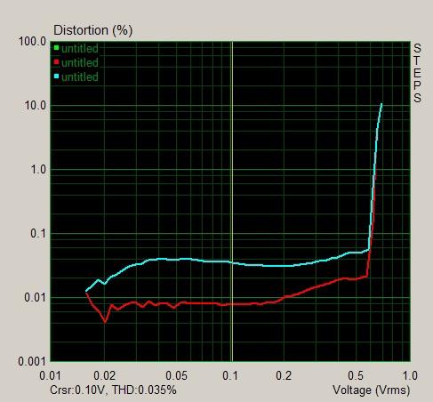 Зависимость искажений от мощности ( на 1 и 10 кГц), где 0,6 В соответствует 74 Вт: