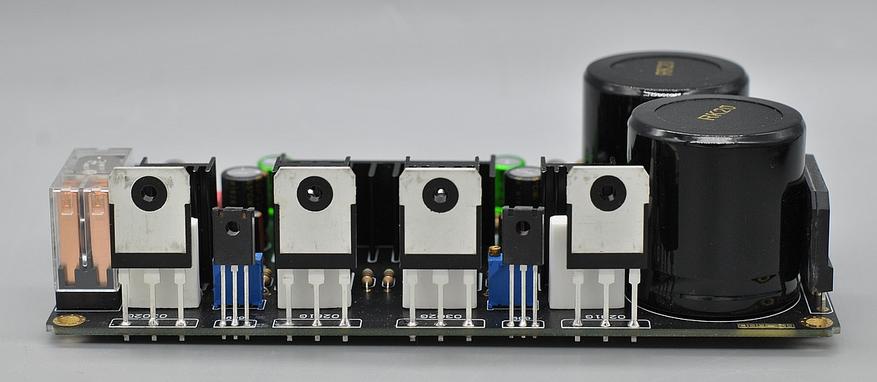 Начнем с питания. Плата питается переменным напряжением со средней точкой. Выпрямитель уже на борту, он состоит из диодного моста и пары электролитических конденсаторов 10000 мкФ 50 В и индикаторного светодиода. Ввод напряжения осуществляется через колодку с винтовыми клеммами. Подавать рекомендуется от 18 до 35 В переменного напряжения, что даст от ±25 до ±50 В постоянного. Выше подавать опасно, так как входные конденсаторы по питанию на 50 В да и такую мощность можно снимать с этой платы только с активных охлаждением. Это просто реализовать, поставить сверху радиатора компьютерный тихий кулер и запитать его через термостат, установленный на радиаторе, настроить примерно на 60-70° С.