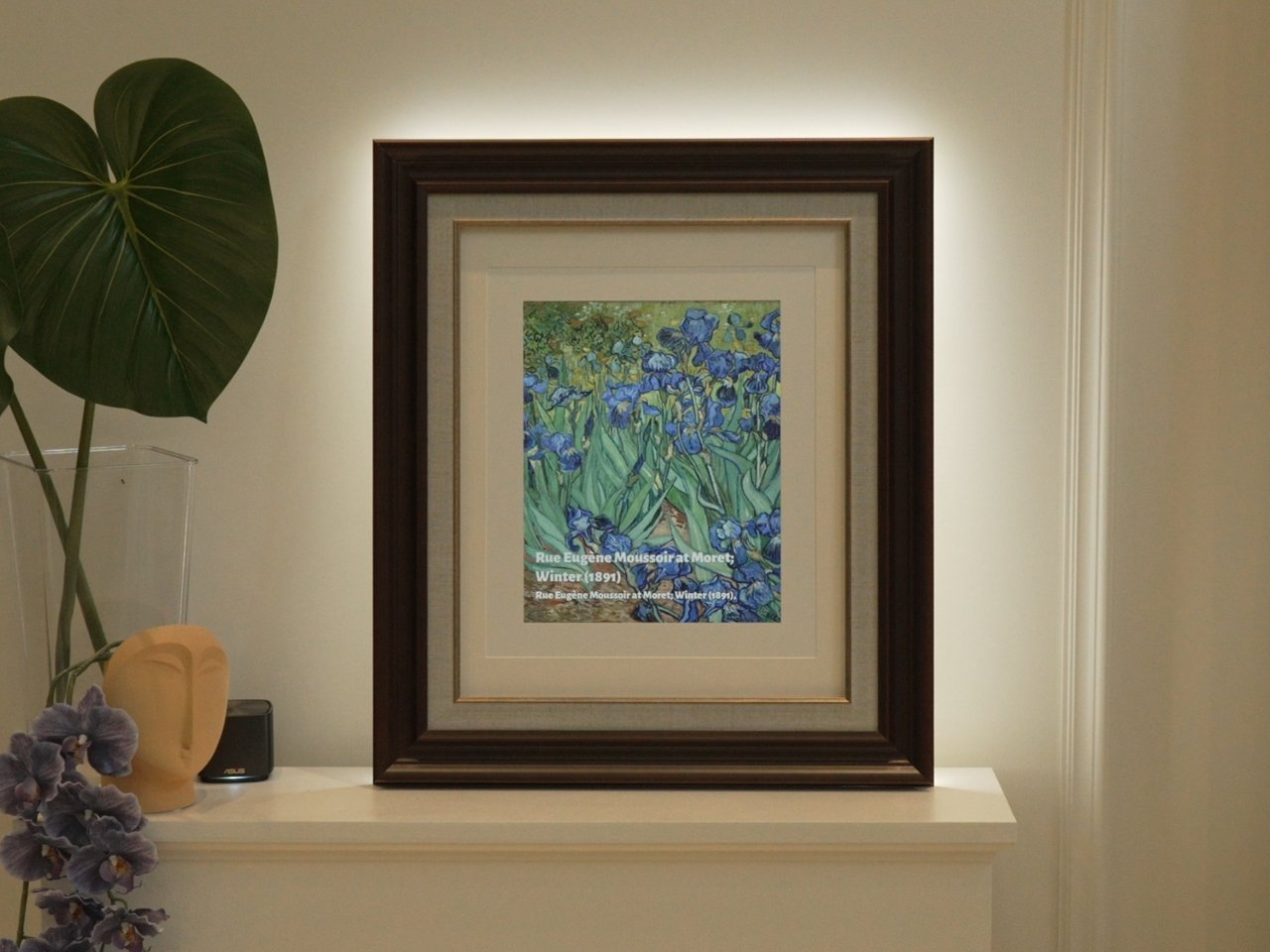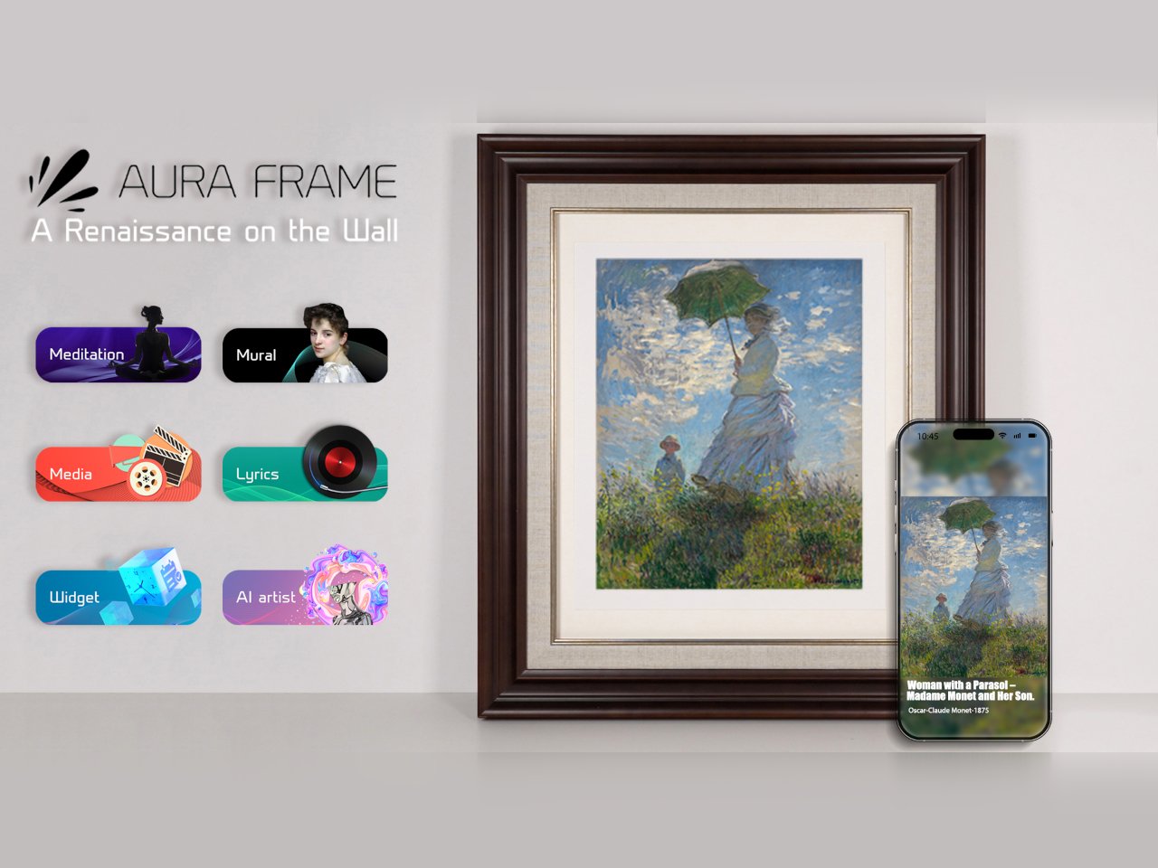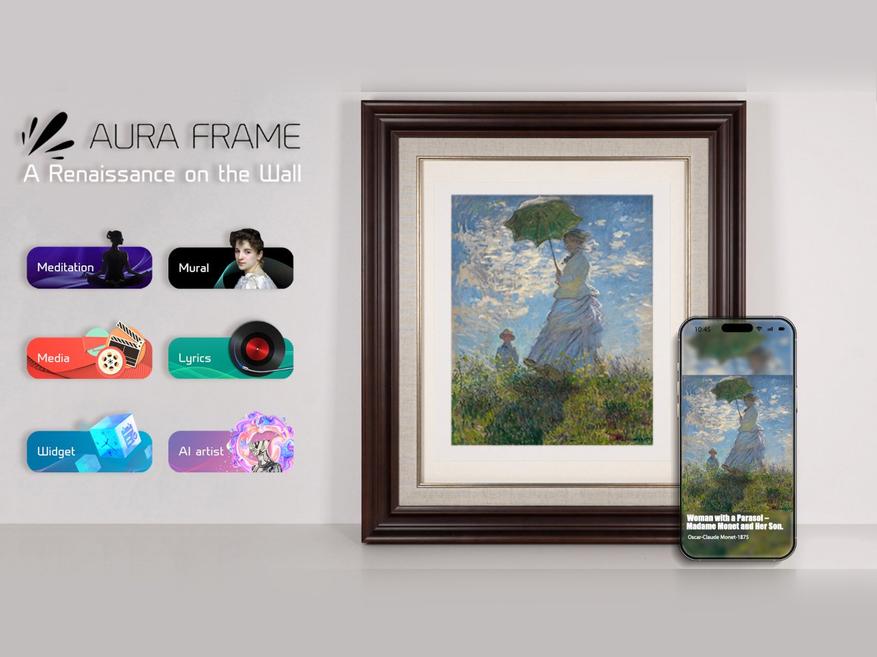 Компания AuraFrame представила новый продукт, сочетающий традиционную картинную раму с цифровым дисплеем и аудиосистемой. Устройство изготавливается из массива североамериканского чёрного ореха или европейского дуба с позолотой и оснащено 20-дюймовым дисплеем, имитирующим текстуру холста с поддержкой 256 уровней оттенков серого и антибликовой технологией.