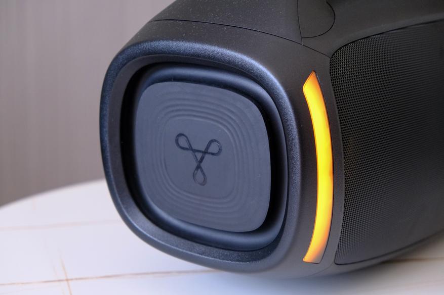 По бокам у колонки находятся пассивные излучатели. Каждый имеет логотип производителя. А с передней стороны находится продолговатый светодиод