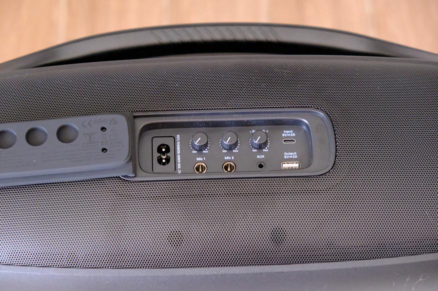 Слева направо: слот для кабеля в розетку (АС), два разъёма 6.3мм для микрофонов (или гитары), три крутилки, две из которых отвечают за громкость своего разъёма, а третья это Reverb добавляющая эффект эха. Там же находится разъём AUX (3.5mm). Еще правее порт type-C только для зарядки колонки, и ниже обычный USB A который работает тоже только для зарядки подключённых устройств. Отдавая 5В 2А от встроенной батареи.