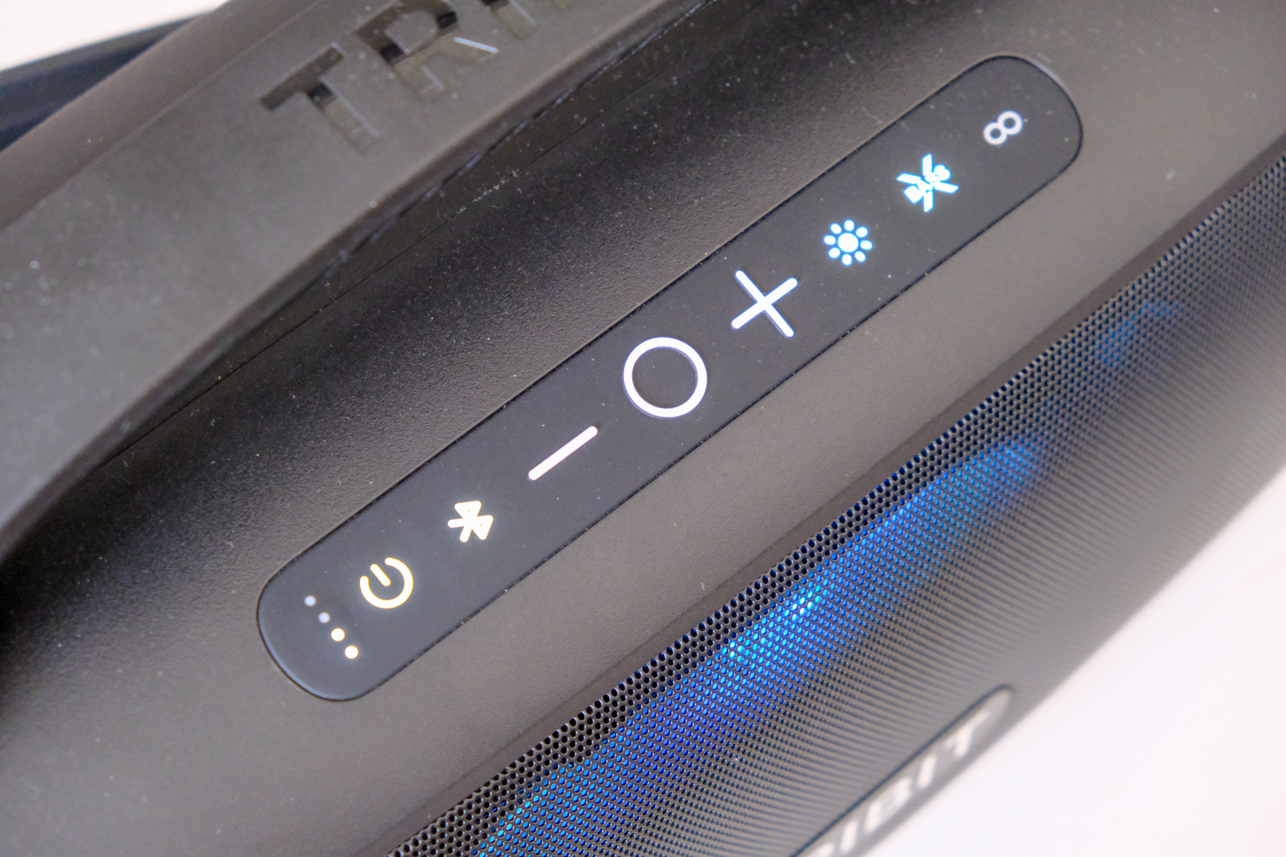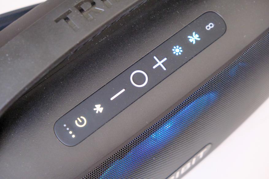 Остальные кнопки более-менее понятны. Кнопка со значком солнца переключает режимы подсветки (или выключает полностью). Кнопка Xbass включает одноименный режим, басов появляется много, очень, иногда даже с перебором. А следующая кнопка в виде знака бесконечности (восьмерка лежащая на боку) — это режим TWS. Если у вас несколько одинаковых колонок, подключаем первую колонку к смартфону, а потом жмём кнопку TWS на обеих колонках, и они соединяются в режим беспроводного стерео. К сожалению, за неимением второй колонки, проверить этот режим не могу. Но хотелось бы.