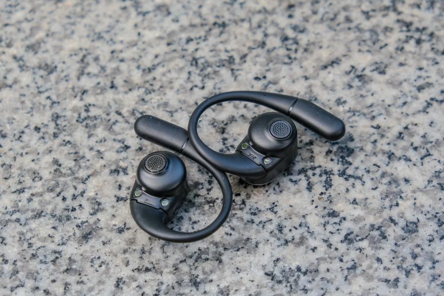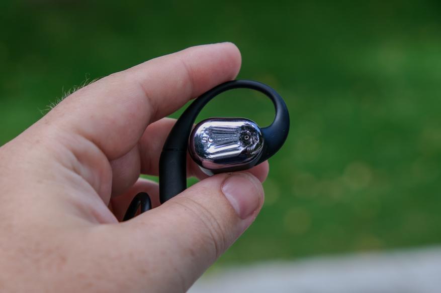 Так как здесь применена технология костной проводимости, в наушниках нет классического звуковода. Но есть сеточка, под которой спрятан динамик. Кстати, как он играет, можно услышать даже поднеся наушники к ушам, не надевая. Но полноценный эффект и звук слышно только когда наушники уже на ушах.