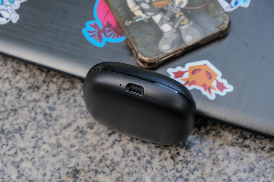 Сам кейс изготовлен из пластика, в меру глянцевый. Но не настолько чтобы прям сильно скользить. На верхней крышке у кейса расположен логотип производителя. Спереди индикатор заряда, а на задней стороне расположен порт USB Type-C для подзарядки