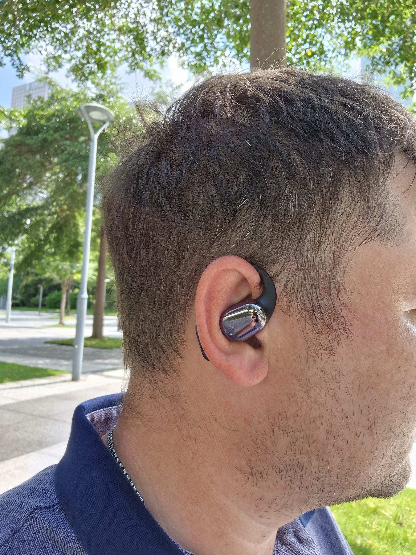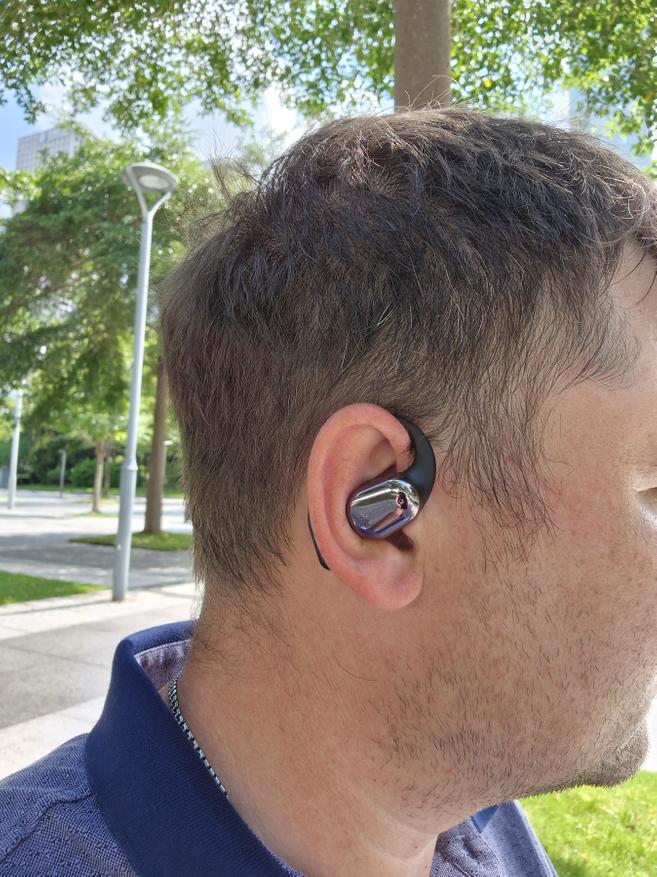 Носить такие наушники достаточно непривычно. Они не вставляются в ушные каналы, а просто ложатся как крючок сверху на уши. И в этом есть огромный плюс, так как они не давят на уши изнутри, практически не ощущаются и при этом не вызывают никакого дискомфорта. Мне прям понравилось. Главное найти точку и наклон, где излучатель будет максимально прилегать к уху.