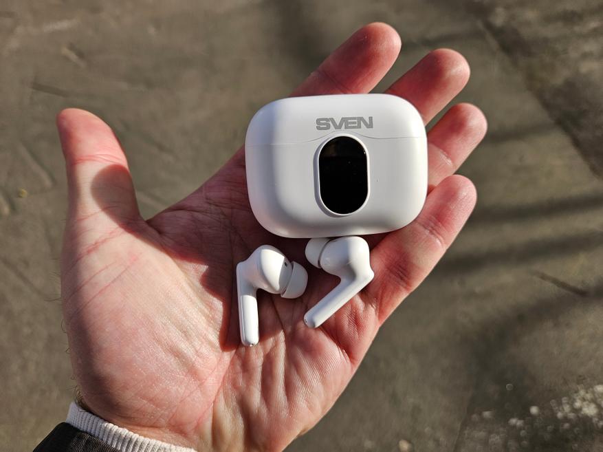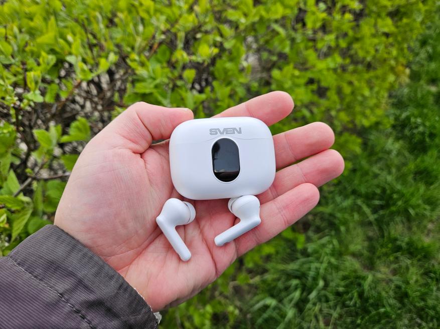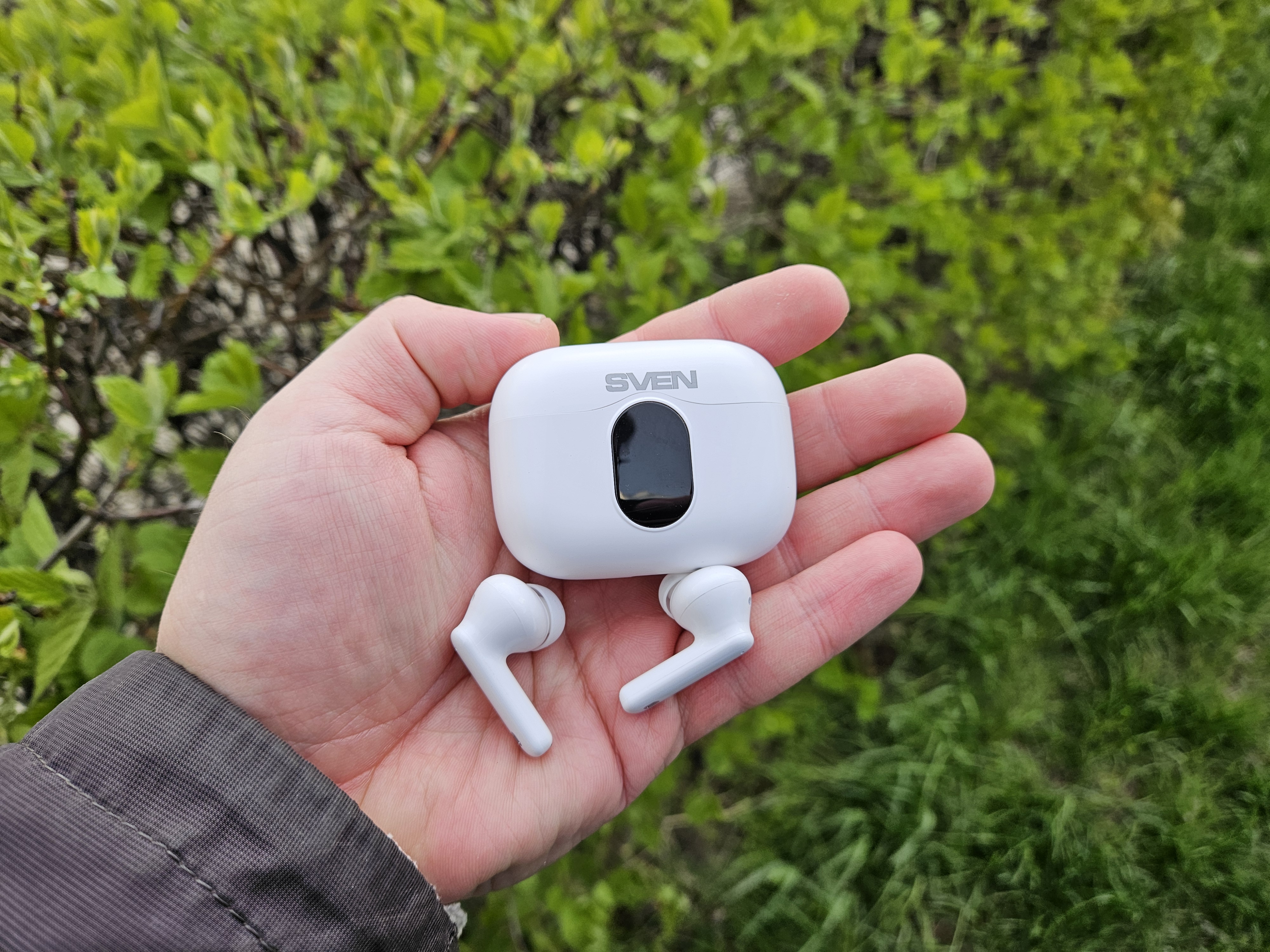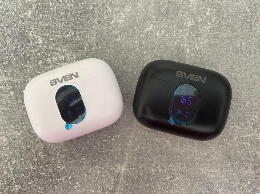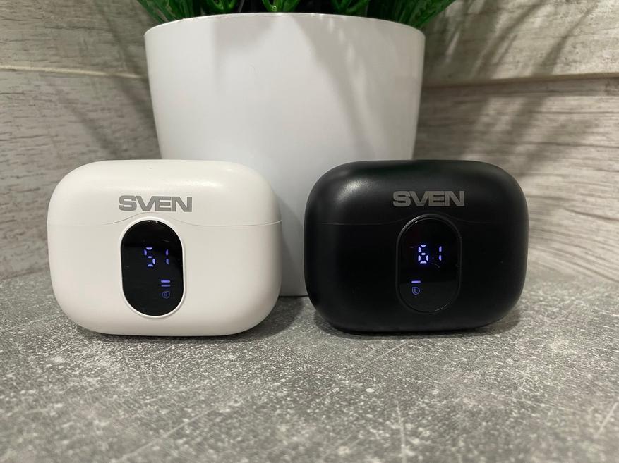 Упаковка TWS-наушников выполнена в современном минималистичном стиле с использованием плотного картона, обеспечивающего надежную защиту устройства. Дизайн коробки выдержан в фирменной сине белой цветовой гамме SVEN. На лицевой стороне коробки расположен логотип бренда, изображение самих наушников, а также ключевые характеристики: поддержка ENC, ANC, IPx4, 13 мм драйверы и общее время работы до 26 часов (включая зарядку от кейса).
