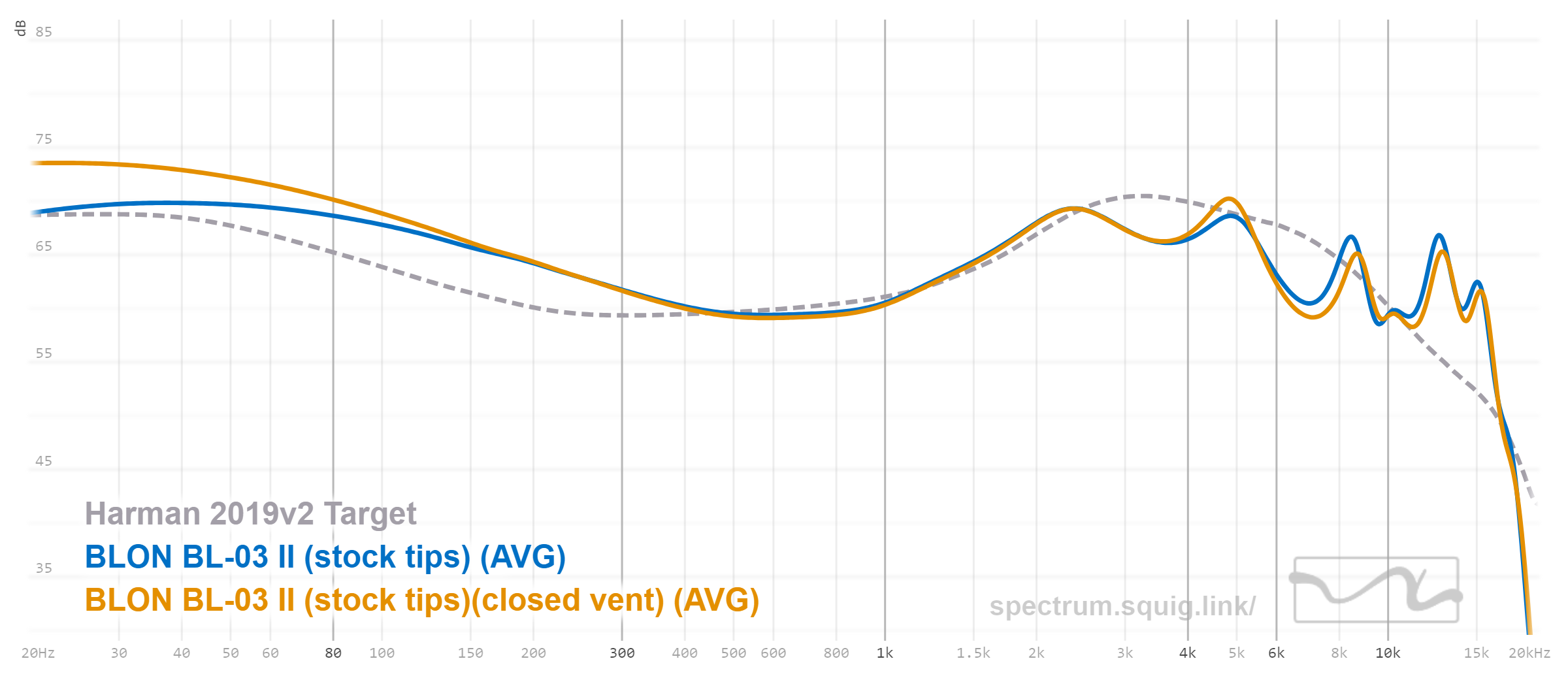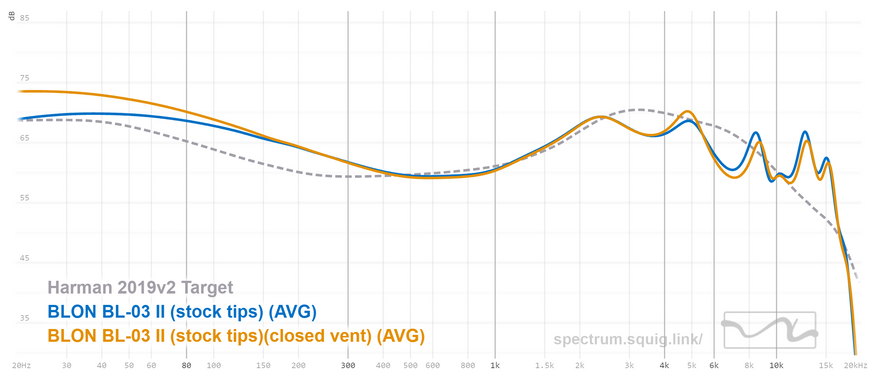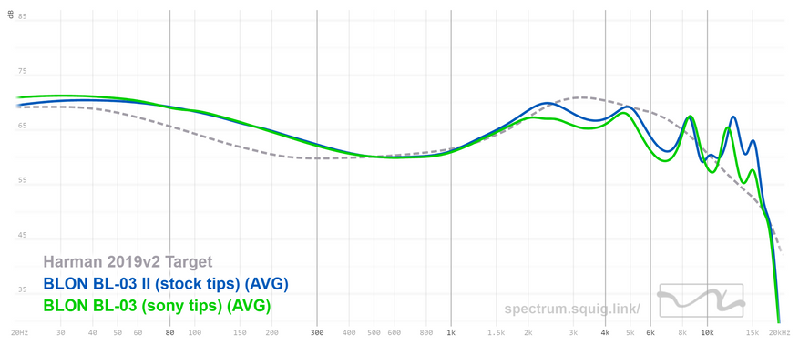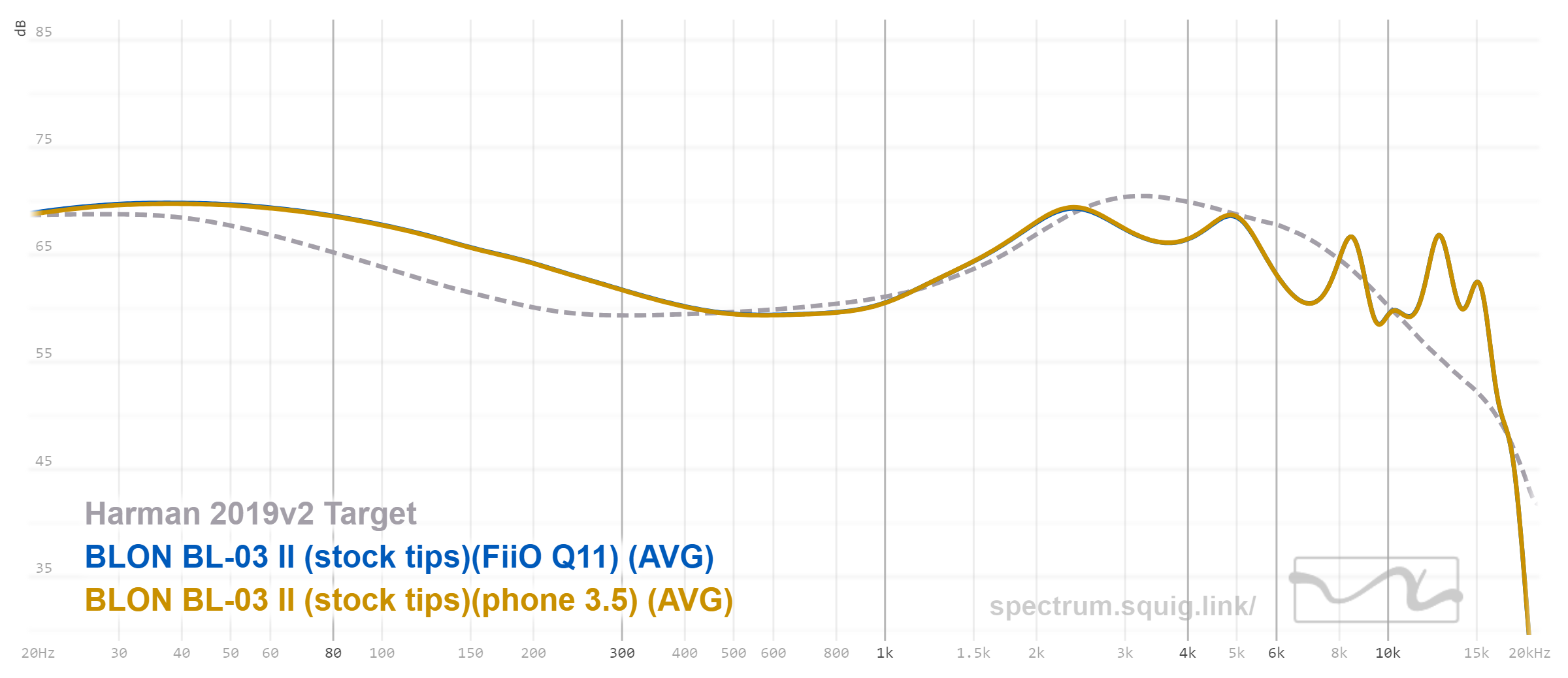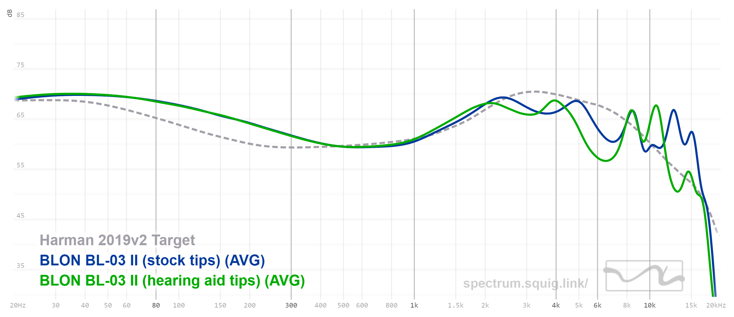 По звучанию и, в частности, по тональному балансу в моем случае есть нюанс. Оригинальные сеточки с фильтрами, которые были установлены с завода, я потерял во время экспериментов и поставил сторонние сетки и фильтры. Сами сетки здесь не важны, но фильтры меняют звучание и ослабляют верхнюю середину, поэтому и графика звучания оригинальных BL-03 у меня нет. И даже не помню какой плотности фильтры я поставил. Но все же приведу график сравнения с тем, что есть, по которому видно, что в целом профили АЧХ совпадают. По качеству звучания мне, если честно, показалось, что это тот же самый динамик, что и в оригинальных BL-03. Возможно, это и не так, но звучат они очень похоже не только тонально, но и в плане проработки звучания я не заметил каких-либо отличий.