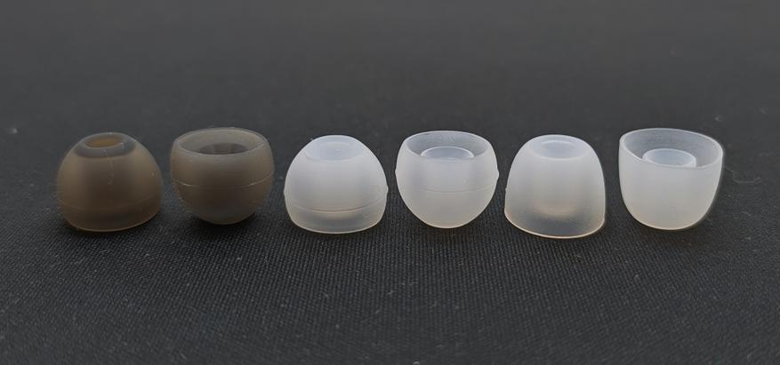 После этого стоковые насадки мне всё так же не хотели давать достойную компрессию, но на удивление насадки с короткими и широкими звуками стали давать вполне приличную посадку. Правда их приходилось периодически поправлять. Не факт, что вам не подойдут стоковые насадки. В целом они выглядят хорошо, и длина звуковода у них неплохая. Всего в комплекте три набора силиконовых насадок размеров S/M/L. Один набор белых и серые практически идентичны, а второй комплект белых отличается более прямоугольными формами. И есть вероятность, что если не подойдут насадки из одного набора, то подойдут из второго.