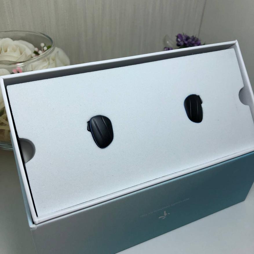 Знакомство с новинкой началось с упаковки и опыта распаковки. Коробка выполнена в сине-голубых тонах с дизайном, напоминающим облако. На передней стороне указана модель наушников, а на задней — их спецификации.