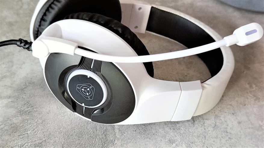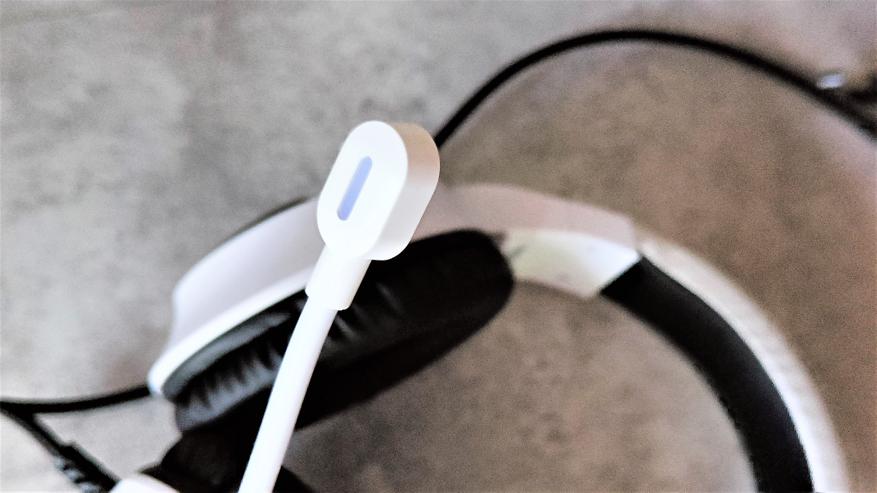 Микрофон жестко подключен к корпусу наушников, умеет поворачиваться в положение разговора и быть отведенным наверх при его ненужности. Сборка винтовая. На конце микрофона шумогасителя (вспененного шарика) нет, но есть светодиодный индикатор.