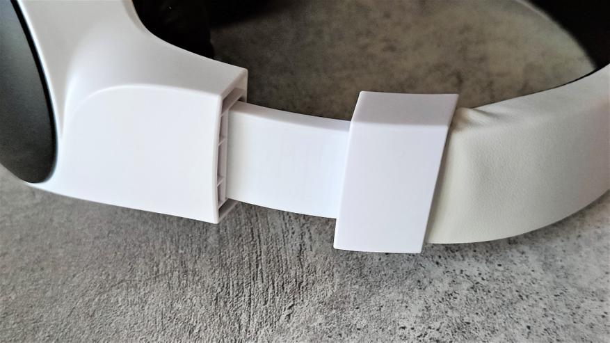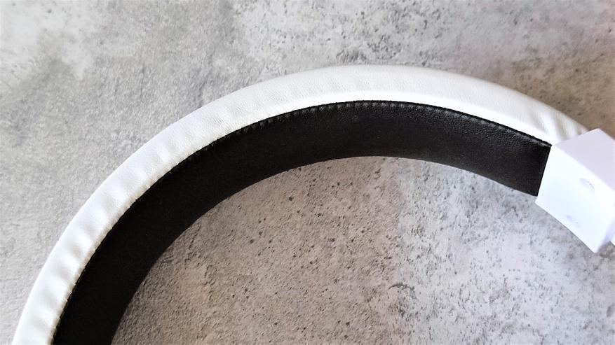 Оголовье пластиковое, защищённое и украшенное мягкой подушкой из кожзаменителя. Нижняя полоса, контактирующая с головой — черного цвета, чтобы не поменяла цвет. На детальном фото можно заметить легкие огрехи бюджетной сборки. Конструкция достаточно хлипковата, но свою функцию выполняет.