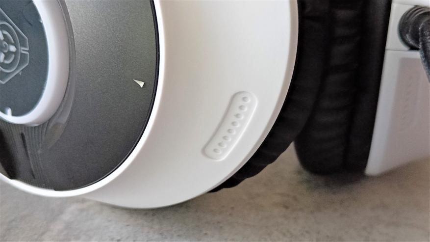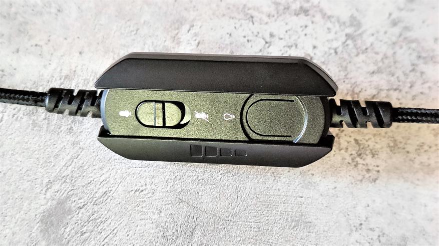 На кабеле отдельно вынесен блок регулировки громкости, на котором дополнительно есть переключатель микрофона, для механического отключения и кнопка активации подсветки. Регулировка громкости проводится классическим колесом на торце блока. Шкала выдавлена на корпусе.