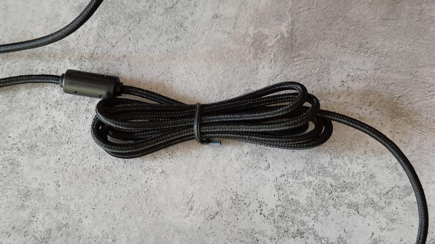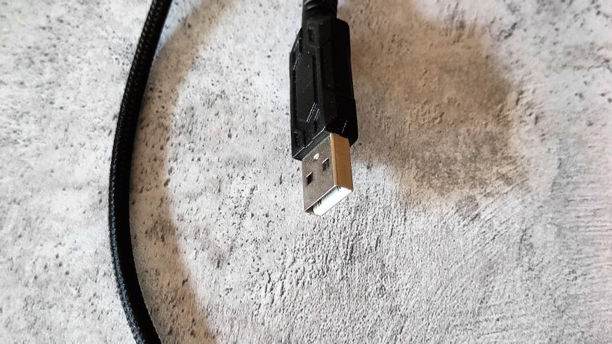 Открываем коробку, внутри нас ждет самая простая комплектация: наушники и инструкция. Наушники, разумеется, с не отсоединяемым кабелем и микрофоном. Кабель изначально смотан проволочкой. Претензий или нареканий к кабелю нет, он вполне нормальной длины — 1,8м, и отличается качественной оплеткой. Нет эффекта памяти. Стандартный USB разъем.