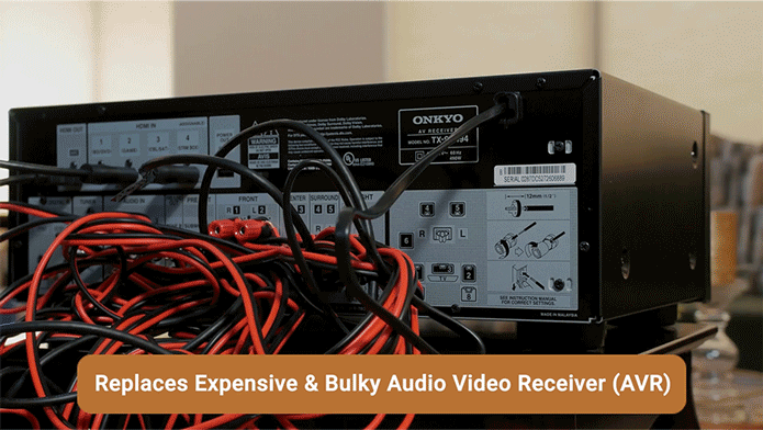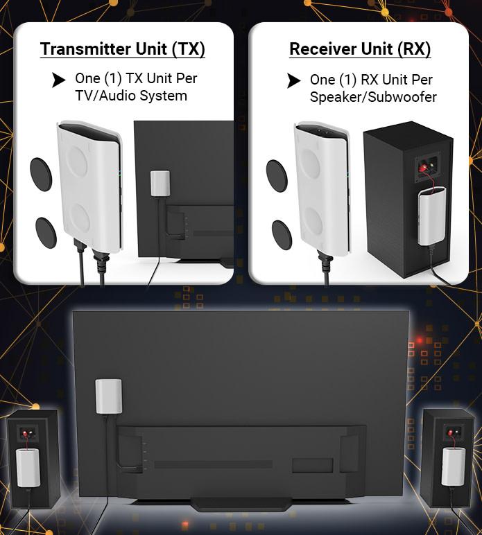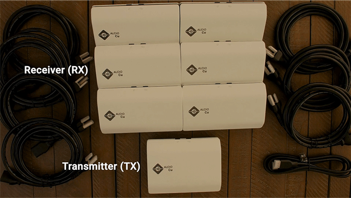 Система Audio Cu состоит из передатчика (TX), который подключается к ТВ или плееру по HDMI ARC, в нем размещен DSP и ЦАП 24bits/96kHz и необходимого количества активных приемников (RX). Применики работают от сети AC 120-240 В, в них подключаются провода от пассивной акустики (можно крепить сзади акустики на магниты). Усилитель класса D в приемнике выдает 65 Вт на 4 Ом (33 Вт/ 8 Ом) при <0.03 THD+N %.
