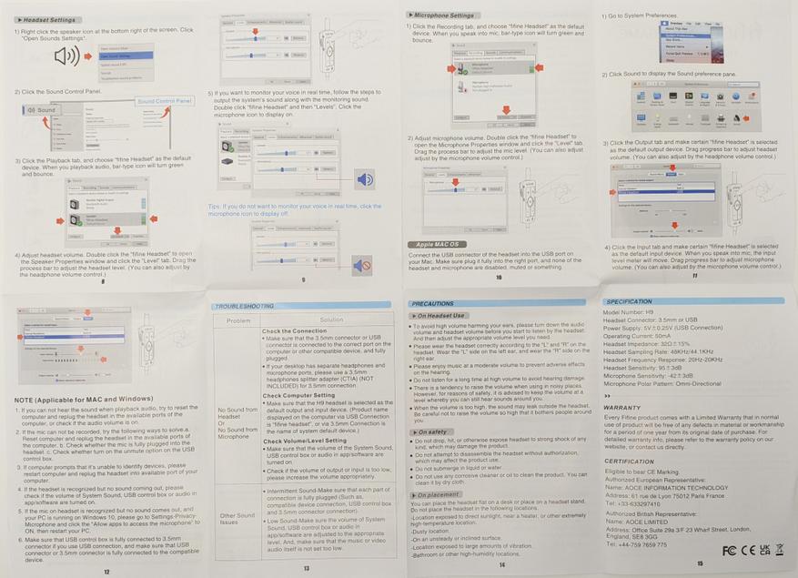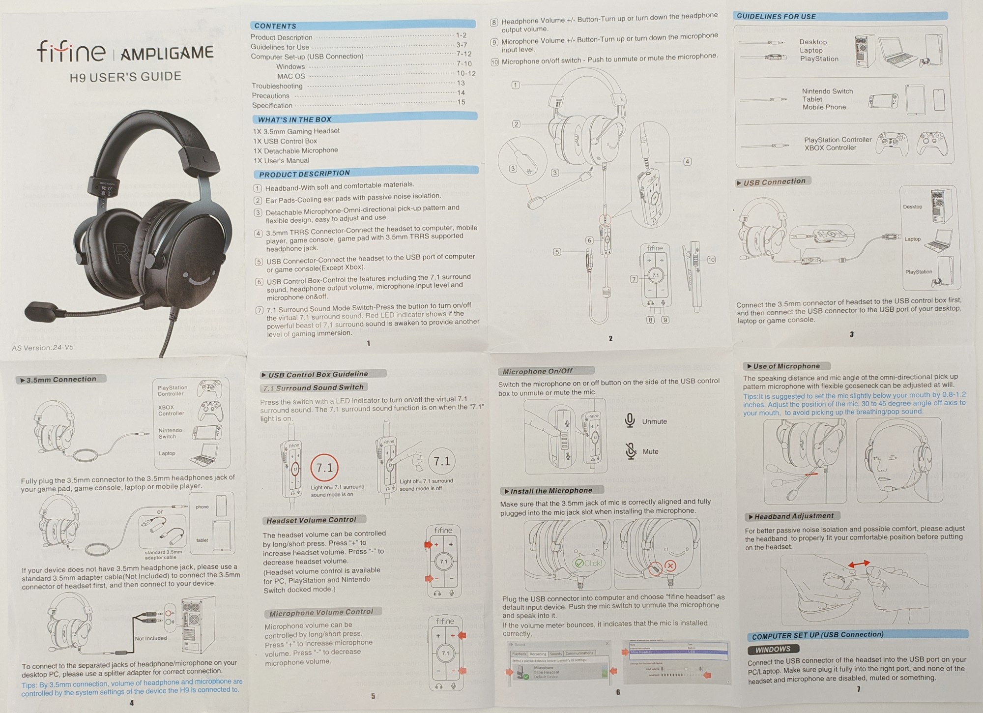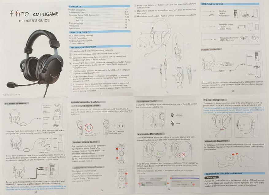 В комплект положили подробную инструкцию, как пользоваться наушниками, в которой также рассказывают, как настроить их в системе Windows. Никаких особых настроек AmpliGame H9 не требуют, и инструкция пригодится только что совсем неопытным пользователям ПК. В любом случае респект Fifine за такую инструкцию, пусть и на английском, но с картинками.