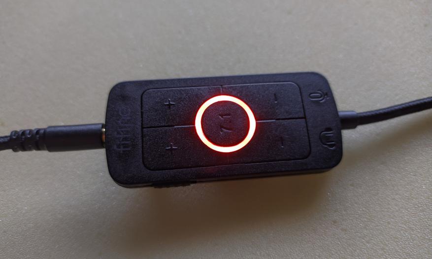 По проводу 3,5 легко раскачиваются по громкости даже простым смартфоном, оставляя еще и хороший запас. Громкости от встроенного ЦАПа на кабеле USB еще больше. При этом, несмотря на явную бюджетность ЦАПа, звучит он довольно хорошо и по всему спектру звучит полноценно. Пространственное звучание 7.1 я не оценил. Ни в музыке, ни в кино, ни в играх. Сильно режет звук на низких частотах, оставляя фактически только средние и высокие, при этом верхние средние еще и форсит. Получается какой-то картонный и размазанный звук в пространстве. Некоторые звуки начинают звучать слишком широко, другие сужаются, и локализация звуков теряется. При включении 7.1 вокруг кнопки горит красное кольцо.