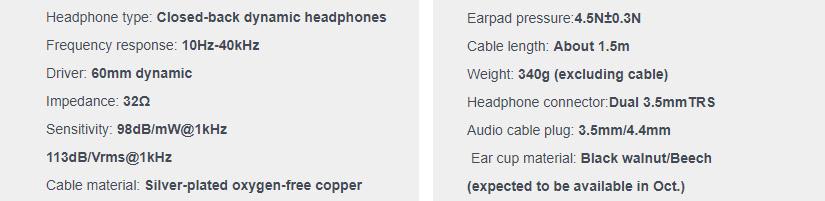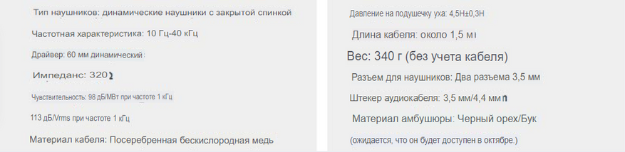 Оголовье из искусственной кожи с внешней стороны и велюровой с внутренней. Закрытая конструкция с чашами овальной формы, в узкой части 95 мм и в широкой 105 мм. Чаши из массива американского черного ореха с корпусами из твердого пластика. Направляющие и крепления из нержавеющей стали. Для каждого наушника свой утопленный разъем подключения кабеля.