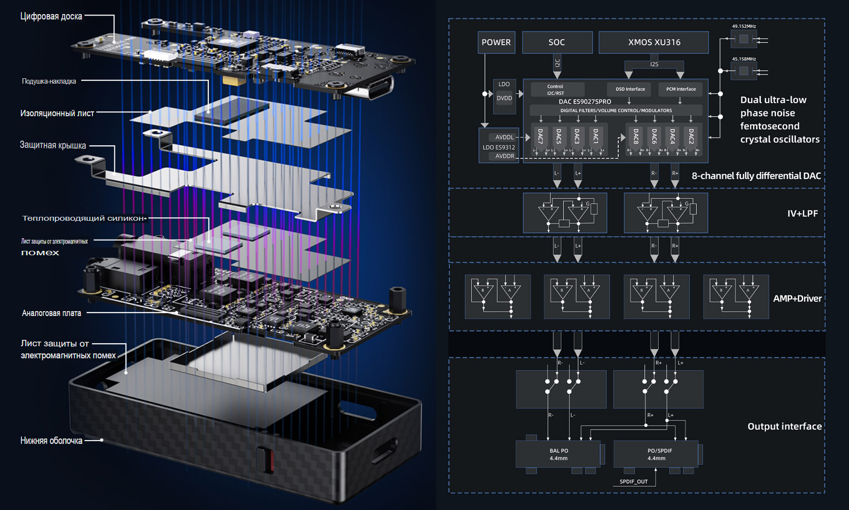 Внутреннее устройство ЦАПа имеет разделение на отдельные цифровую и аналоговую платы, между которыми есть специальные изоляционные листы с теплопроводными элементами и дополнительная защитная пластина. Всё это в совокупности создает экранирование, а также позволяет поглощать и рассеивать температуру, что приводит к эффективному снижению тепловых шумов.