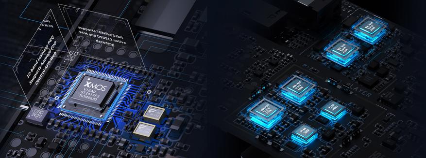 - 16-ядерный процессор XMOS XU316 обладает профессиональным качеством звука через USB, высокой производительностью, низкой задержкой и поддержкой встроенного декодирования PCM до 768 кГц/32 бит и DSD512.