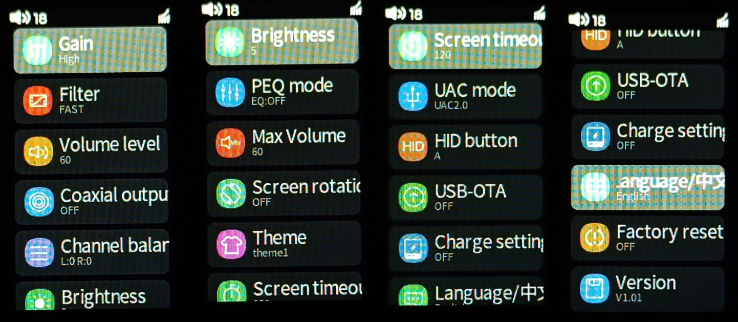 В настройках ЦАПа можно в частотности настроить количество шагов громкости (60 или 120), выбрать фильтр низких частот и пресет эквалайзера, настроить баланс, выставить яркость и таймаут экрана, посмотреть версию прошивки и сделать сброс до заводских настроек.