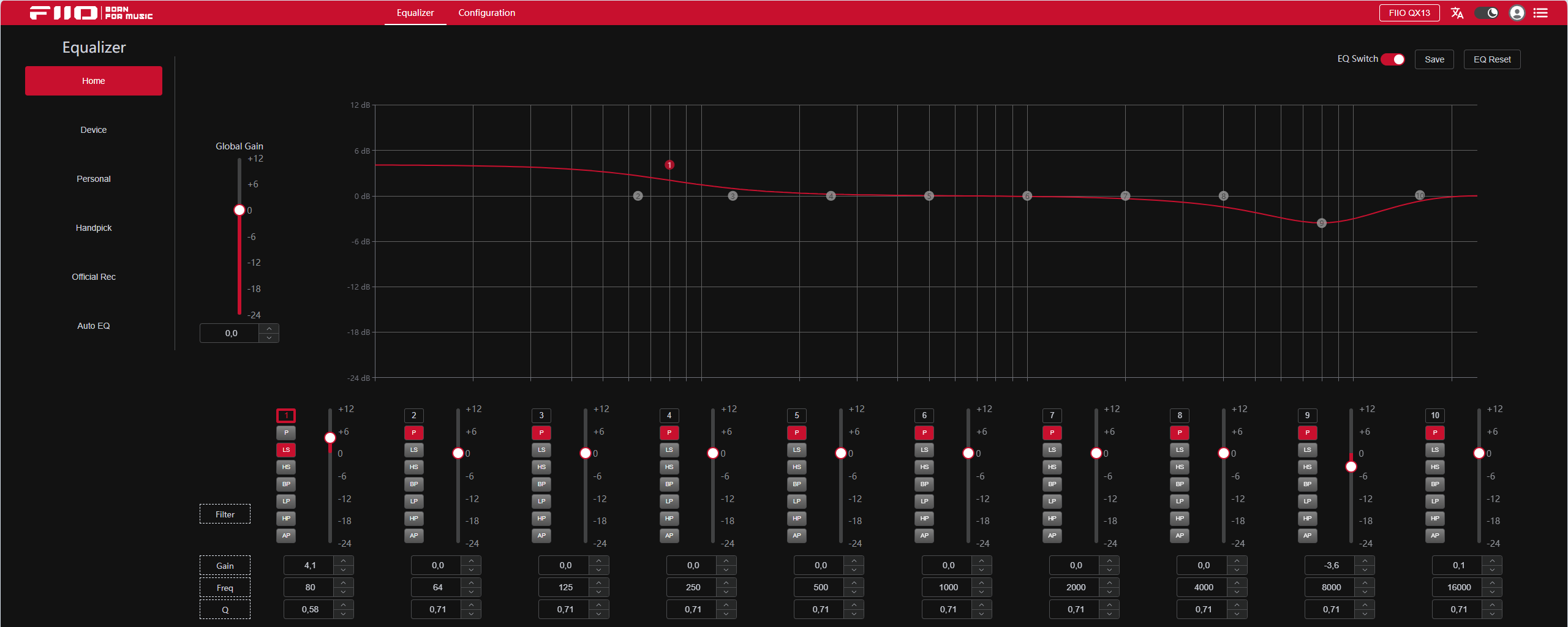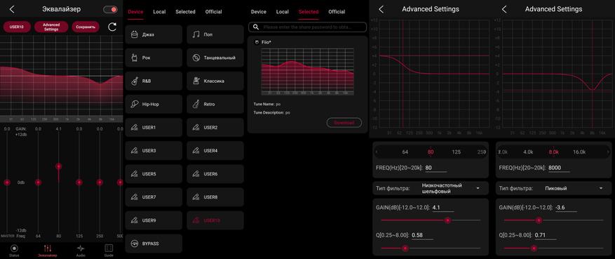 Для настройки эквалайзера нужно в боковом меню выбрать «Device» и отметить кастомный пресет для изменений. Они обозначены как USER1 — USER10. Для каждой полосы можно указать нужное значение частоты и необходимое усиление/ослабление. Для эквализации есть обычный колокол (P), которому можно задать ширину влияния через Q, а также шельфы для высоких (HS) и низких частот (LS), у которых через Q регулируется крутизна спада. Но для радикальных настроек предусмотрен функционал полного среза высоких (LP) или низких частот (HP) или колокол с выделением нужной частоты и со срезом остального диапазона звука (BP). Этим режимам также доступна ширина полосы и крутизна спада Q. После настройки необходимо нажать «Save» и подтвердить сохранение изменений в устройстве. Всё то же самое доступно и в приложении.