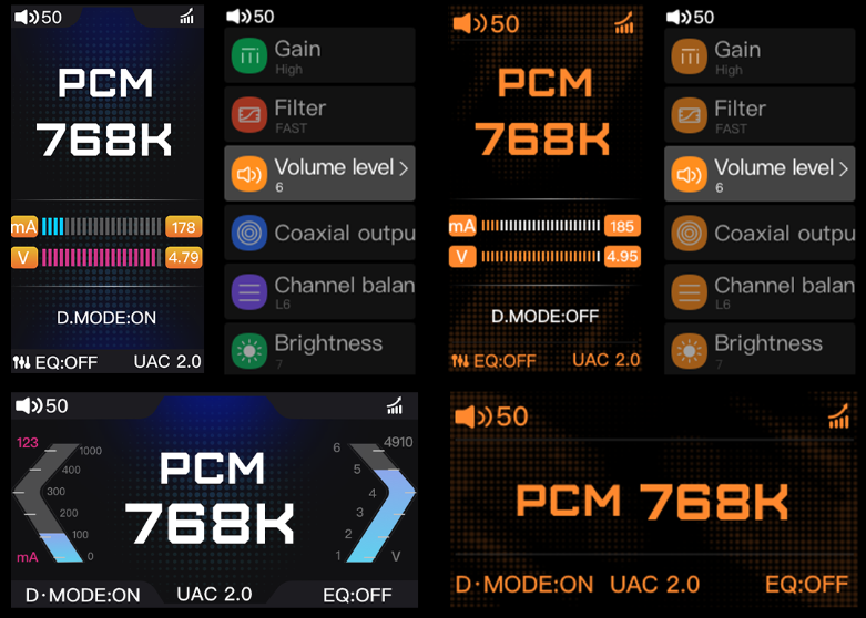 На выбор доступны четыре темы, которые имеют два варианта цветового исполнения, каждый из которых представлен в вертикальной и горизонтальной теме. Также есть в меню и возможность повернуть экран на 180 градусов. Для трех тем на экране предусмотрено отображение потребляемого тока и напряжения. На экране отображается вся необходимая информация о текущих настройках ЦАПа, также есть всплывашки при переключении Desktop Mode, play/pause и переключения треков. Для настройки громкости включается отдельный экран с визуализацией, и текущая громкость также отражается в верхнем левом углу экрана.